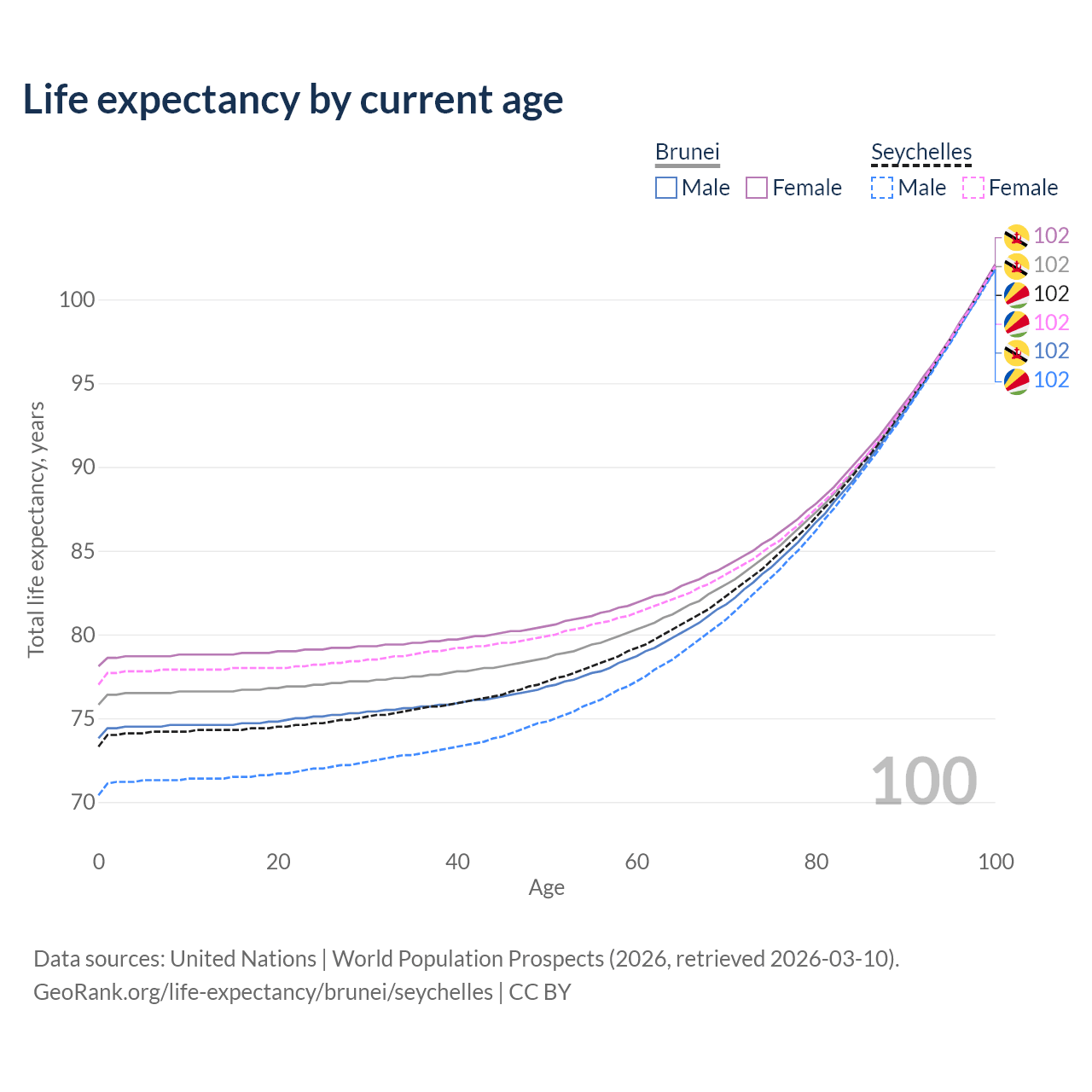 This life expectancy calculator shows the odds of living to 100, 95, 90, and below based on current age for both males and females in Brunei and the Seychelles, along with mean and median age of death. The calculations are based on the 2026 life tables (actuarial tables) from the UN World Population Prospects.