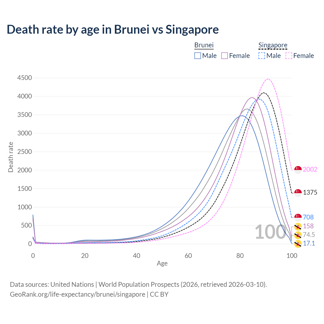 In Brunei, the most common age of death is 83, compared to 89 in Singapore. The median age of death is 79.2 in Brunei and 86.5 in Singapore, meaning only half of each cohort is expected to live past that age.