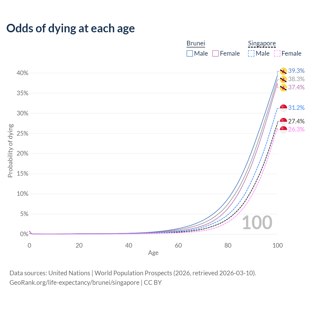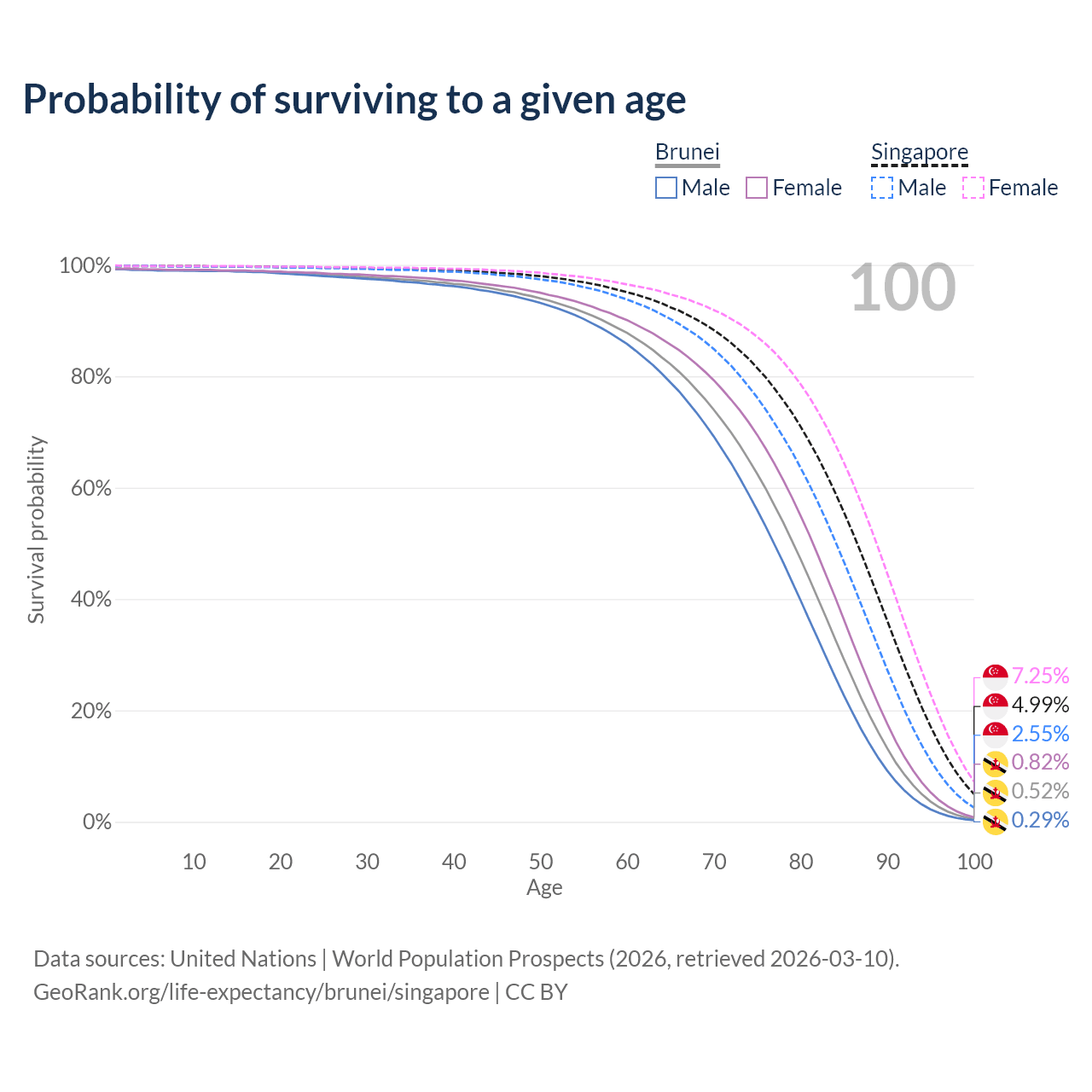 This life expectancy calculator shows the odds of living to 100, 95, 90, and below based on current age for both males and females in Brunei and Singapore, along with mean and median age of death. The calculations are based on the 2026 life tables (actuarial tables) from the UN World Population Prospects.