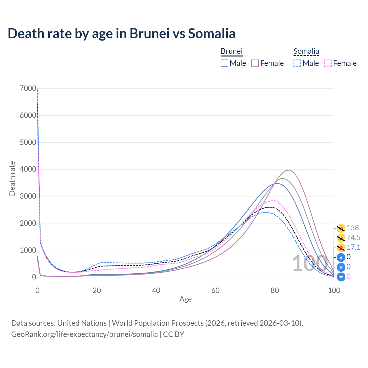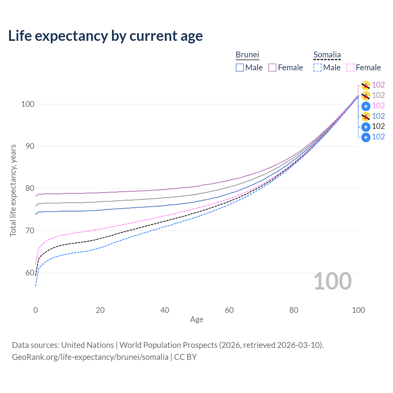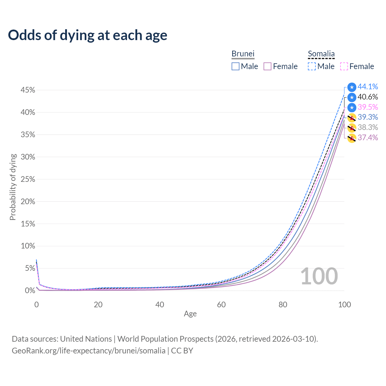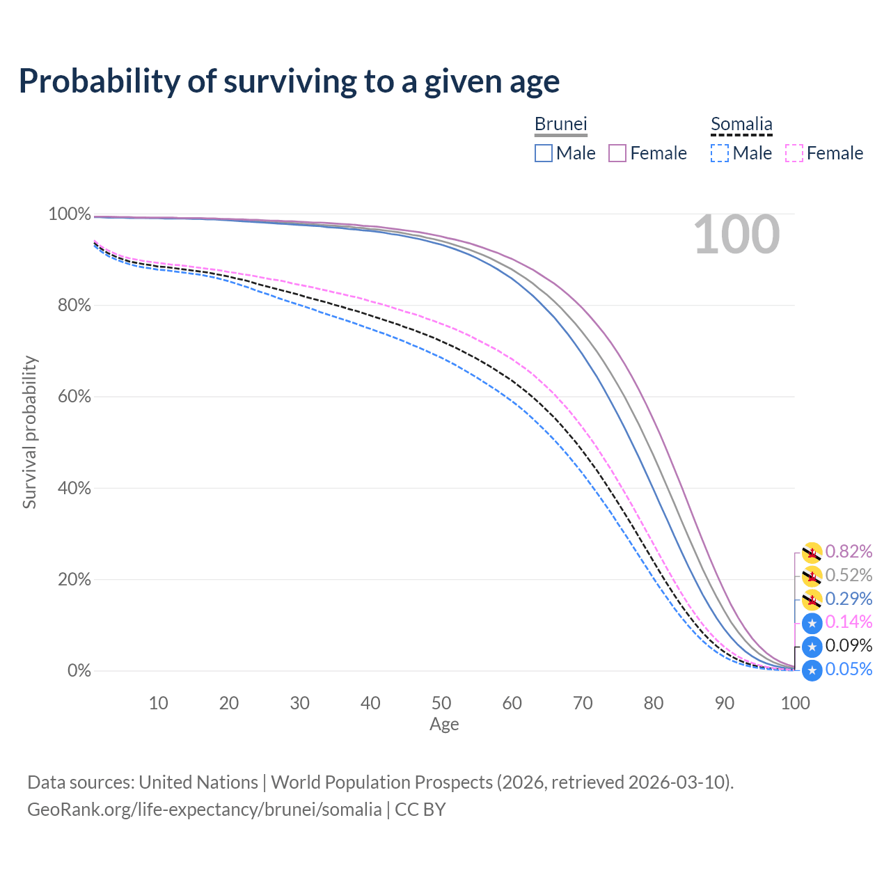 This life expectancy calculator shows the odds of living to 100, 95, 90, and below based on current age for both males and females in Brunei and Somalia, along with mean and median age of death. The calculations are based on the 2026 life tables (actuarial tables) from the UN World Population Prospects.