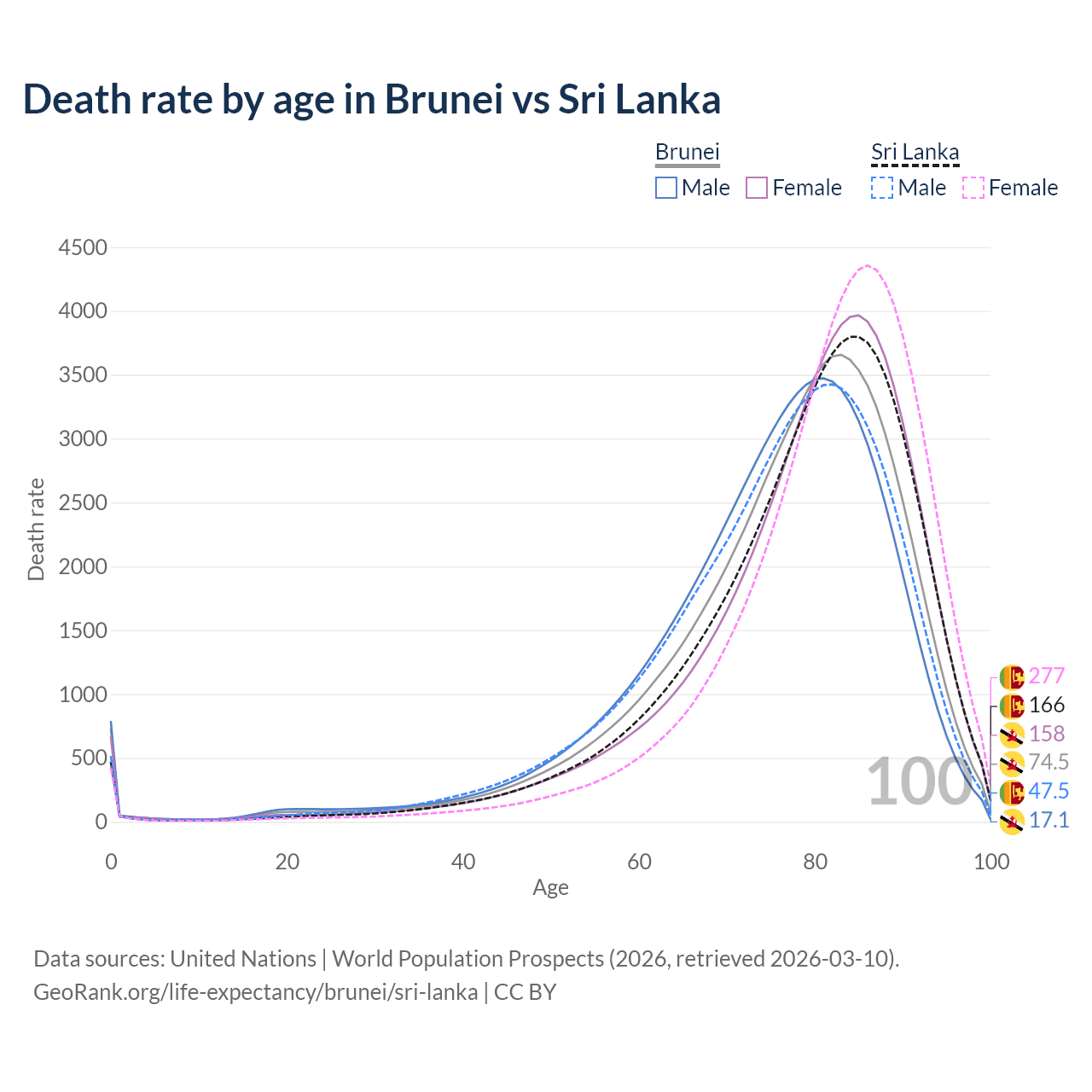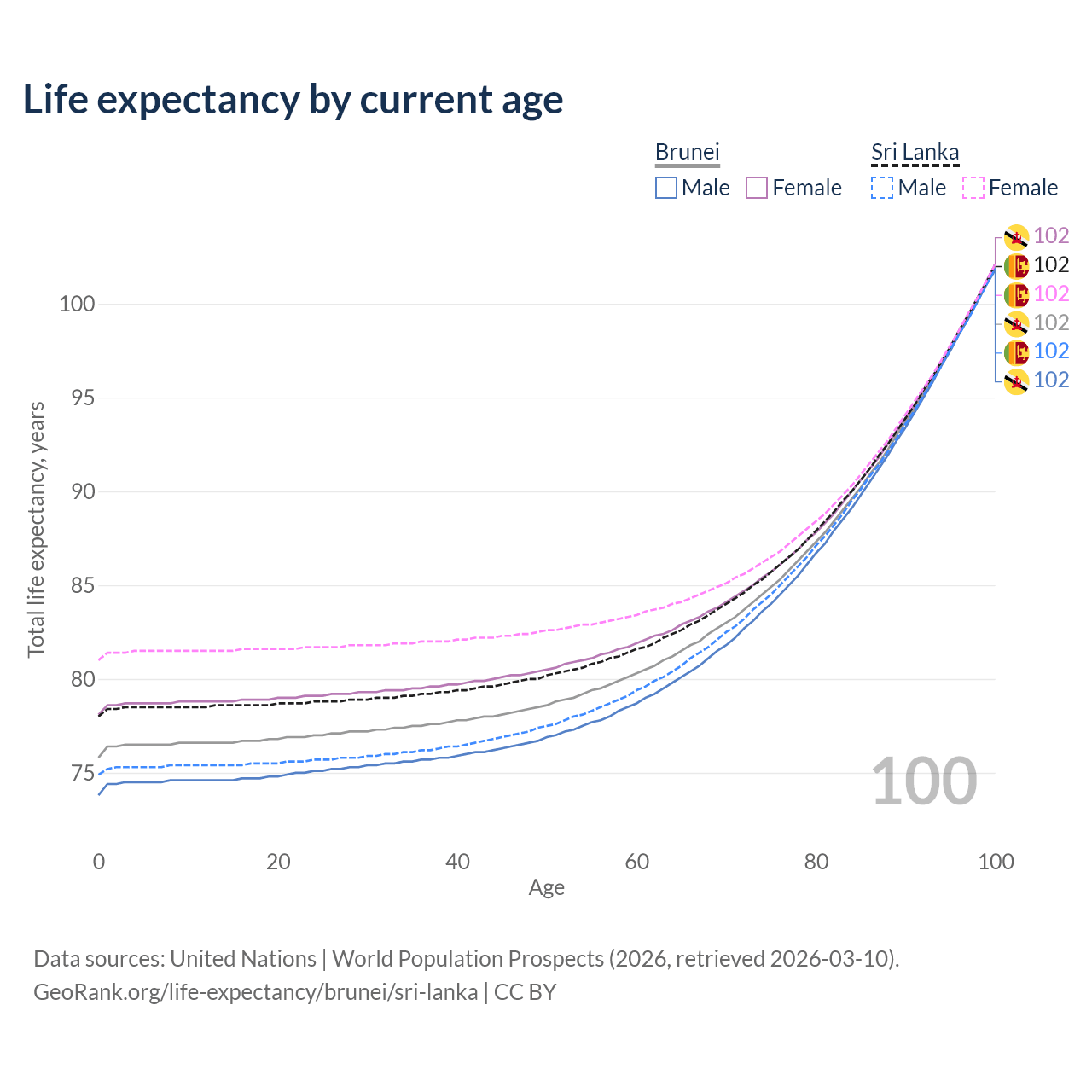 This life expectancy calculator shows the odds of living to 100, 95, 90, and below based on current age for both males and females in Brunei and Sri Lanka, along with mean and median age of death. The calculations are based on the 2026 life tables (actuarial tables) from the UN World Population Prospects.