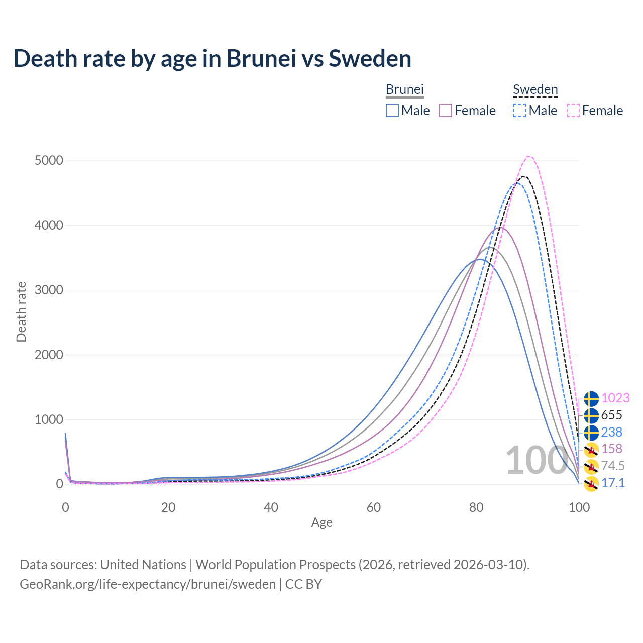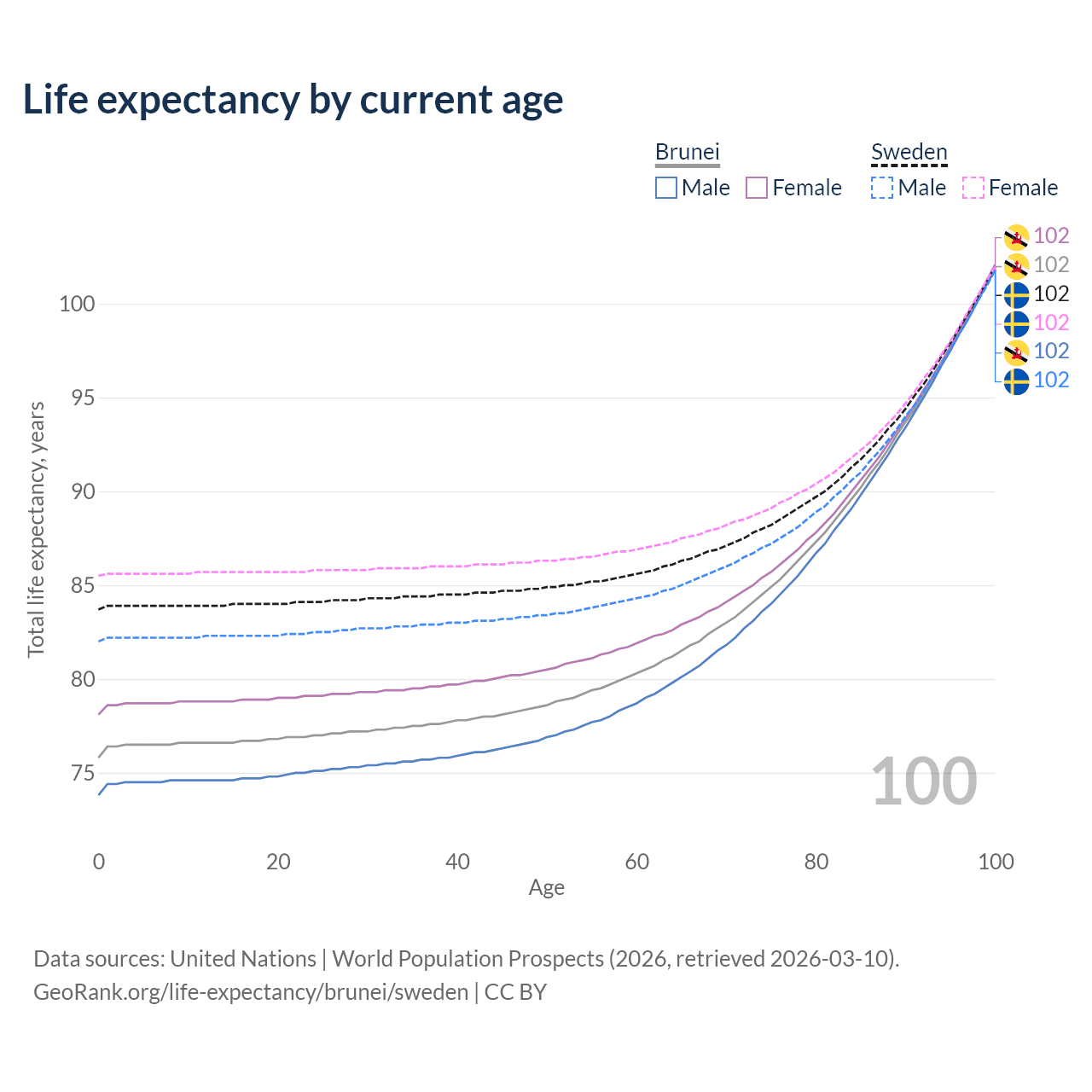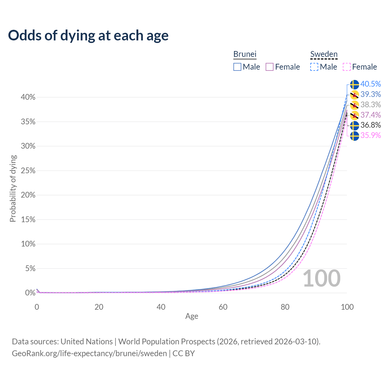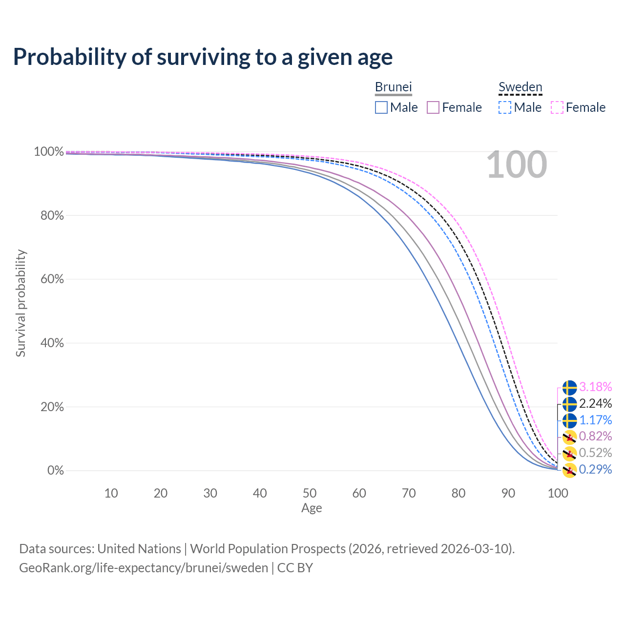 This life expectancy calculator shows the odds of living to 100, 95, 90, and below based on current age for both males and females in Brunei and Sweden, along with mean and median age of death. The calculations are based on the 2026 life tables (actuarial tables) from the UN World Population Prospects.