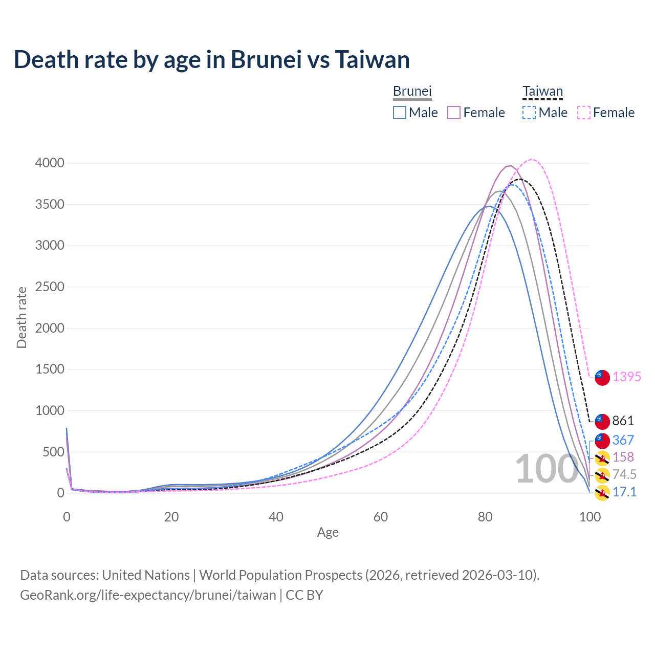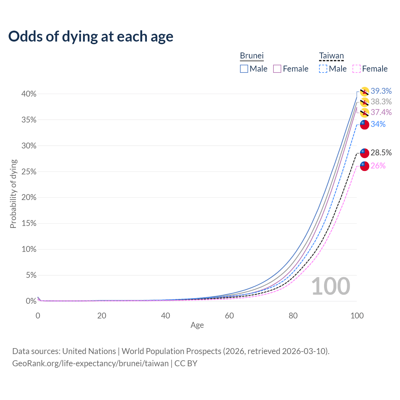 This life expectancy calculator shows the odds of living to 100, 95, 90, and below based on current age for both males and females in Brunei and Taiwan, along with mean and median age of death. The calculations are based on the 2026 life tables (actuarial tables) from the UN World Population Prospects.