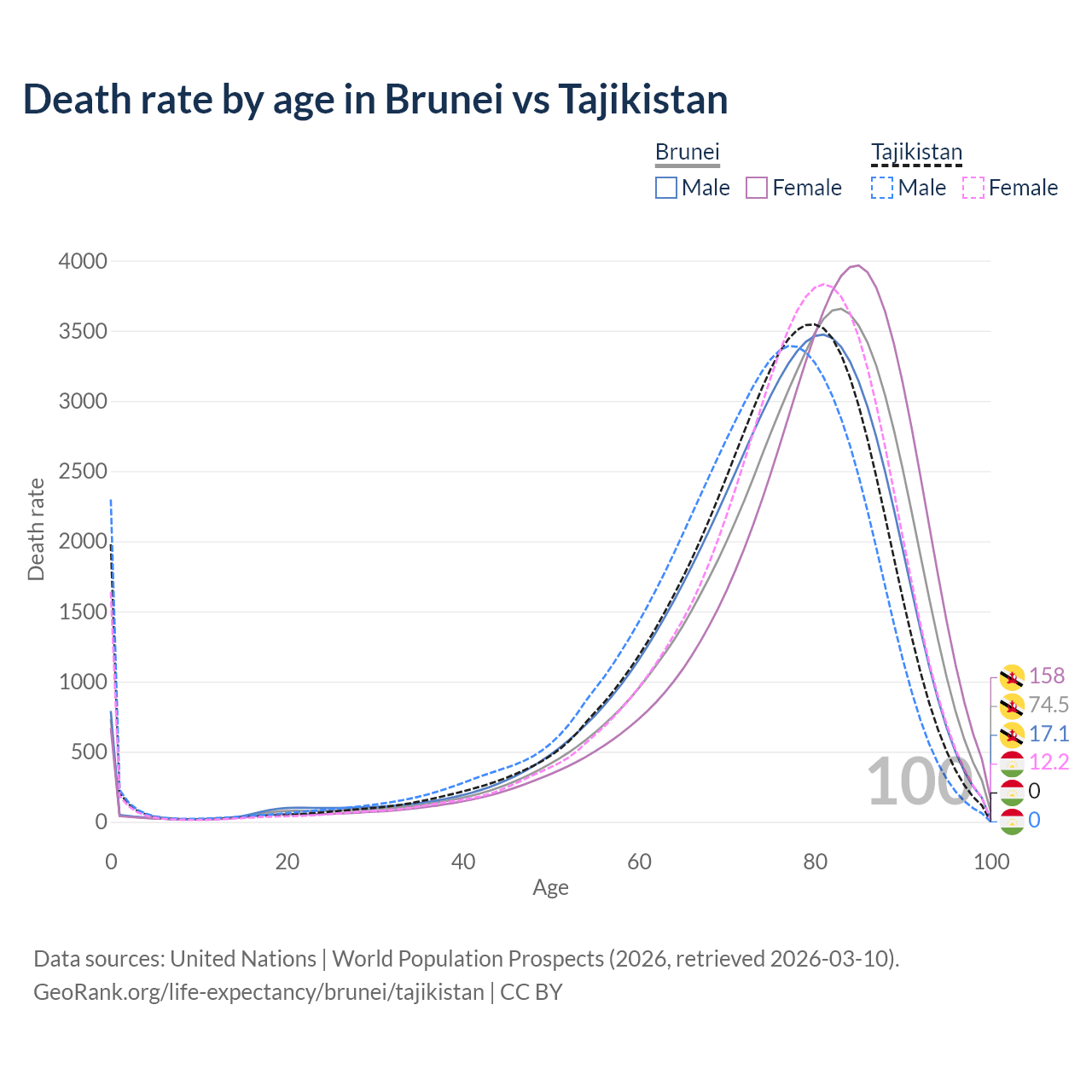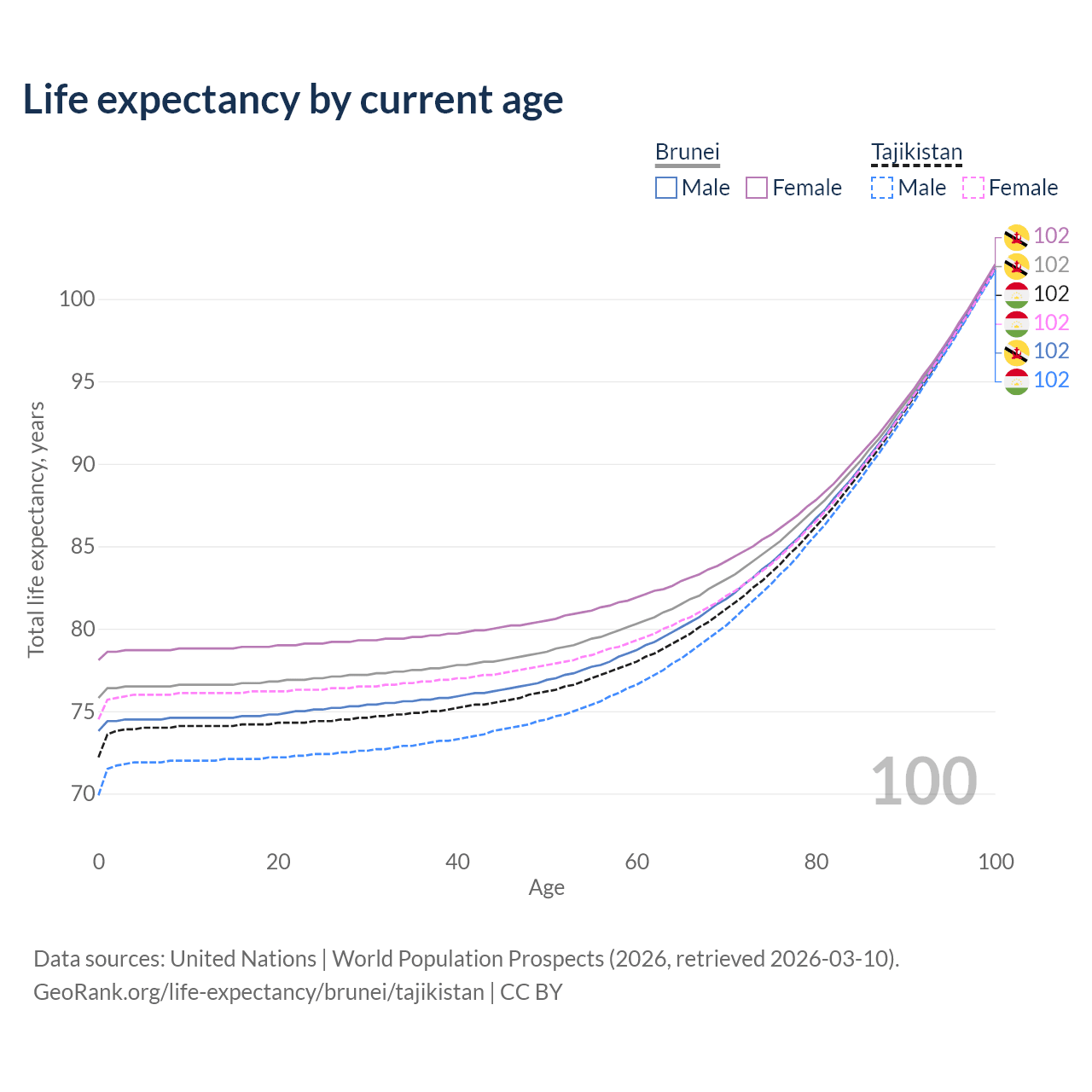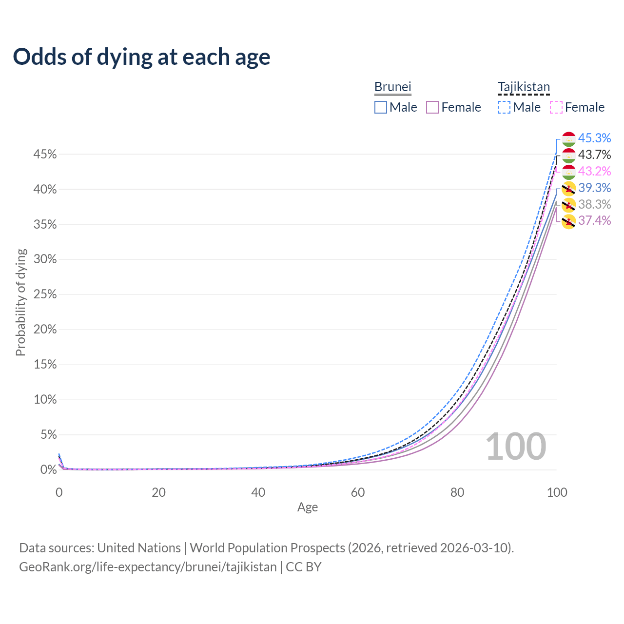 This life expectancy calculator shows the odds of living to 100, 95, 90, and below based on current age for both males and females in Brunei and Tajikistan, along with mean and median age of death. The calculations are based on the 2026 life tables (actuarial tables) from the UN World Population Prospects.