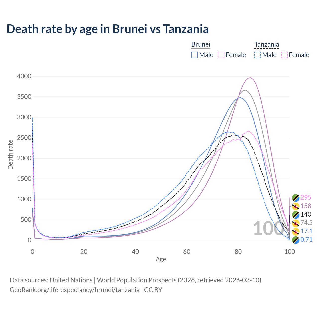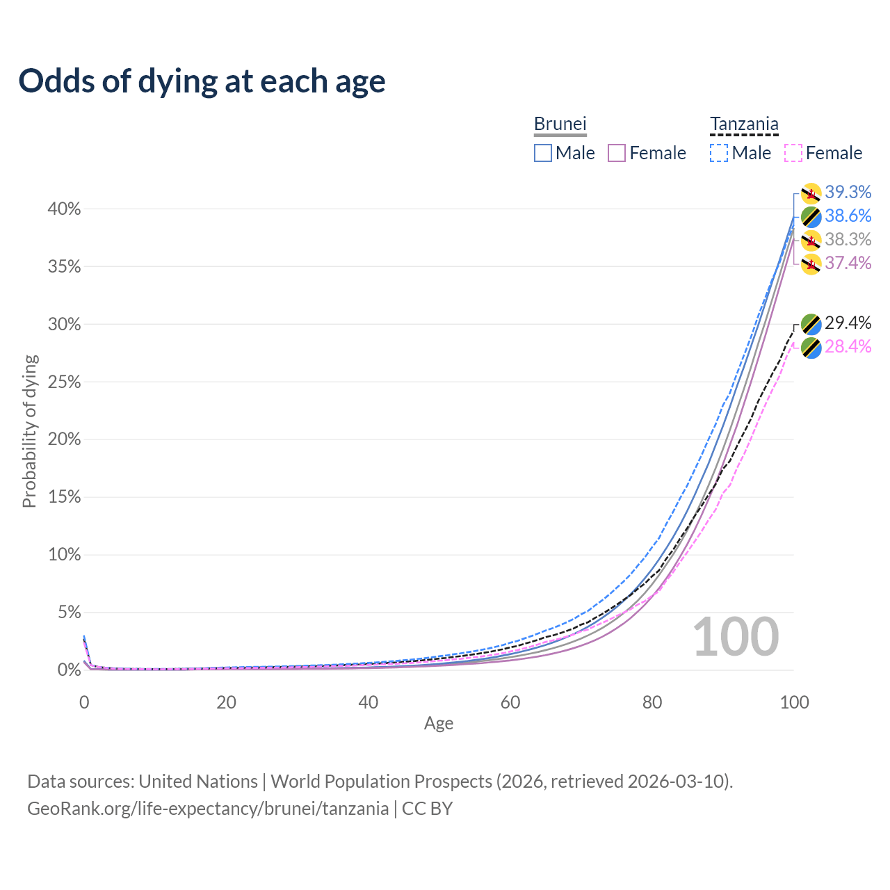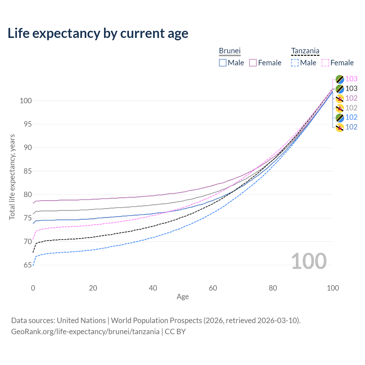 This life expectancy calculator shows the odds of living to 100, 95, 90, and below based on current age for both males and females in Brunei and Tanzania, along with mean and median age of death. The calculations are based on the 2026 life tables (actuarial tables) from the UN World Population Prospects.