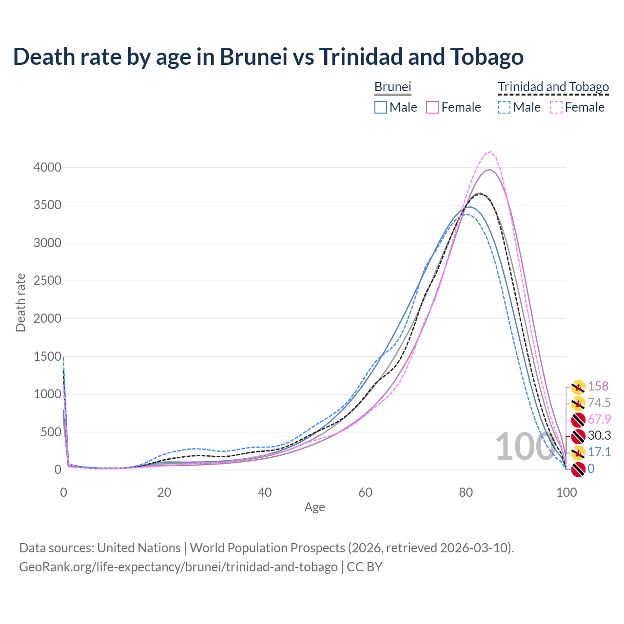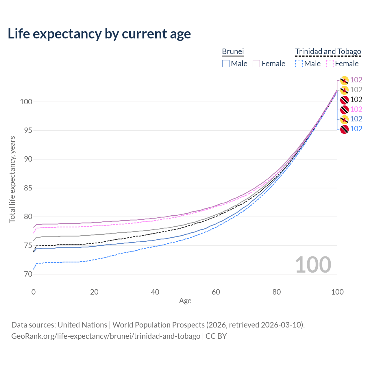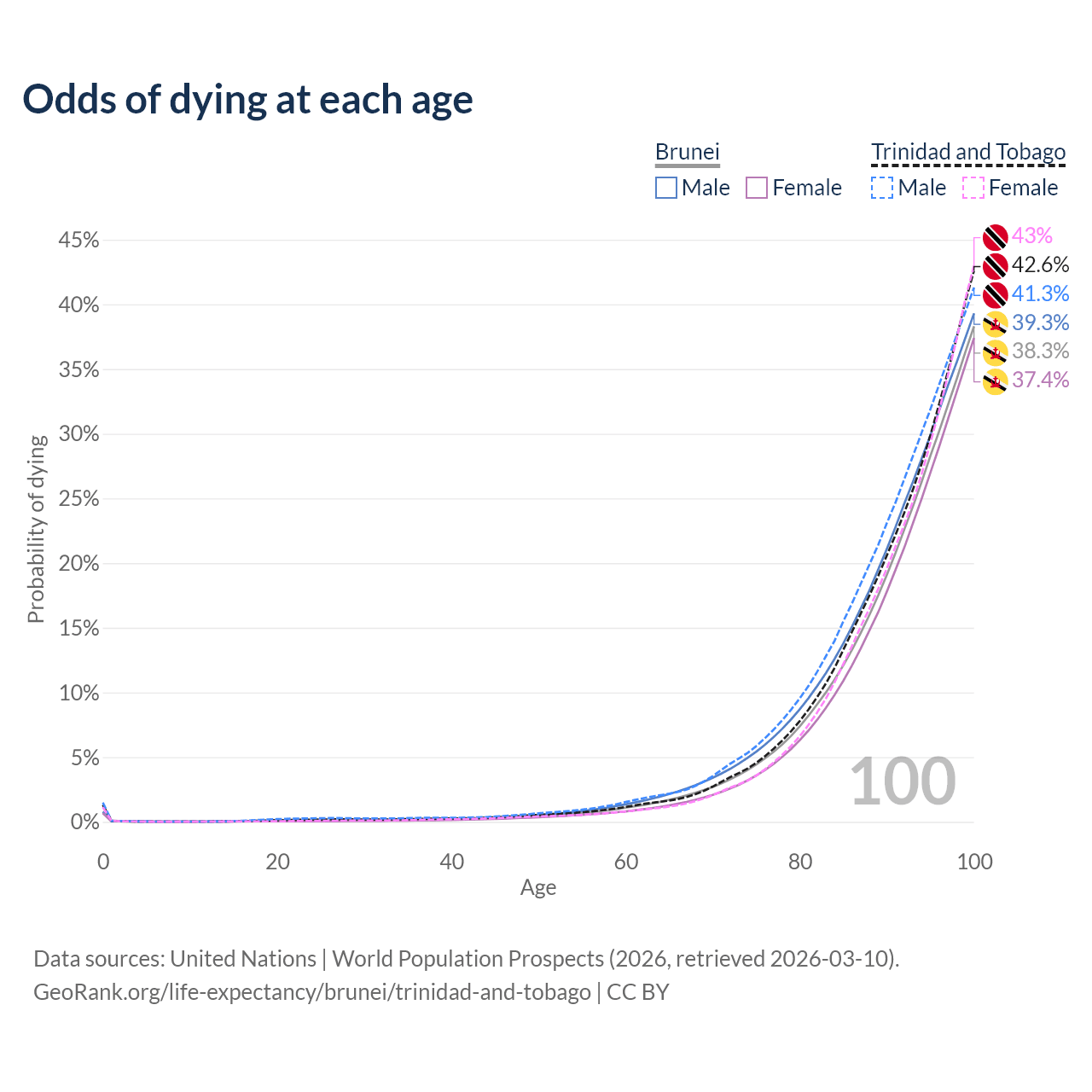 This life expectancy calculator shows the odds of living to 100, 95, 90, and below based on current age for both males and females in Brunei and Trinidad and Tobago, along with mean and median age of death. The calculations are based on the 2026 life tables (actuarial tables) from the UN World Population Prospects.