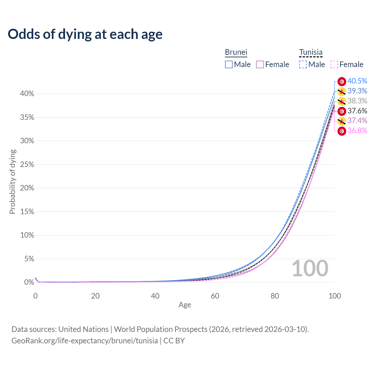 This life expectancy calculator shows the odds of living to 100, 95, 90, and below based on current age for both males and females in Brunei and Tunisia, along with mean and median age of death. The calculations are based on the 2026 life tables (actuarial tables) from the UN World Population Prospects.