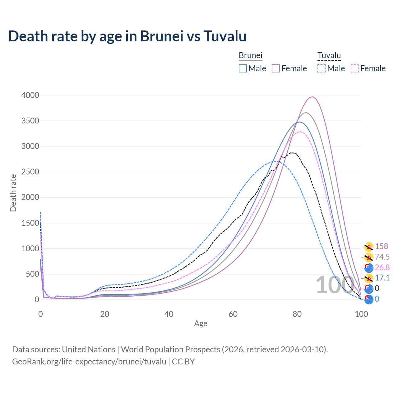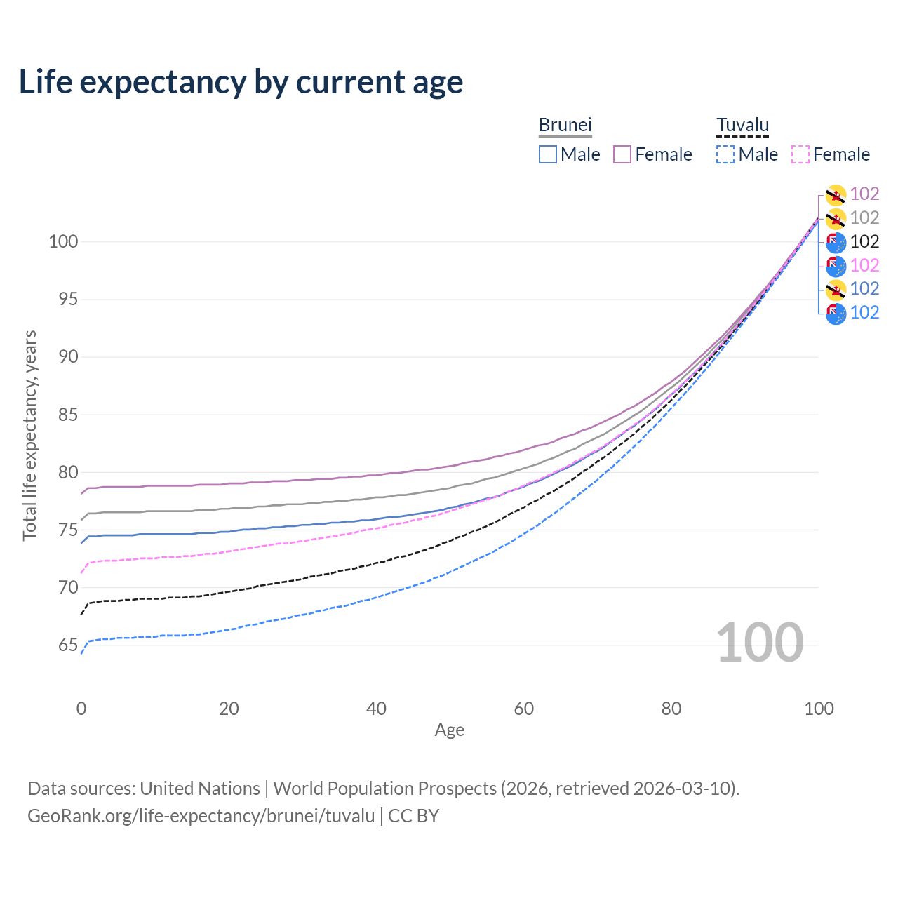 This life expectancy calculator shows the odds of living to 100, 95, 90, and below based on current age for both males and females in Brunei and Tuvalu, along with mean and median age of death. The calculations are based on the 2026 life tables (actuarial tables) from the UN World Population Prospects.