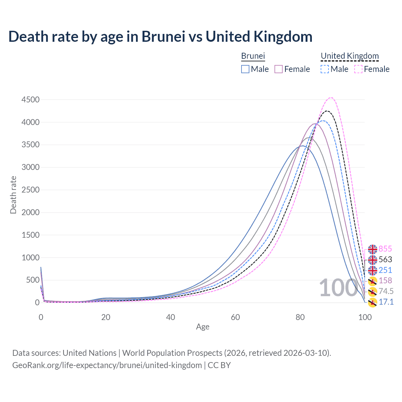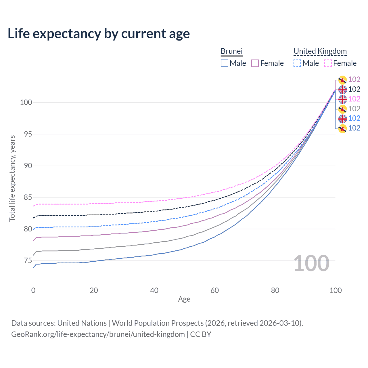 This life expectancy calculator shows the odds of living to 100, 95, 90, and below based on current age for both males and females in Brunei and the United Kingdom, along with mean and median age of death. The calculations are based on the 2026 life tables (actuarial tables) from the UN World Population Prospects.