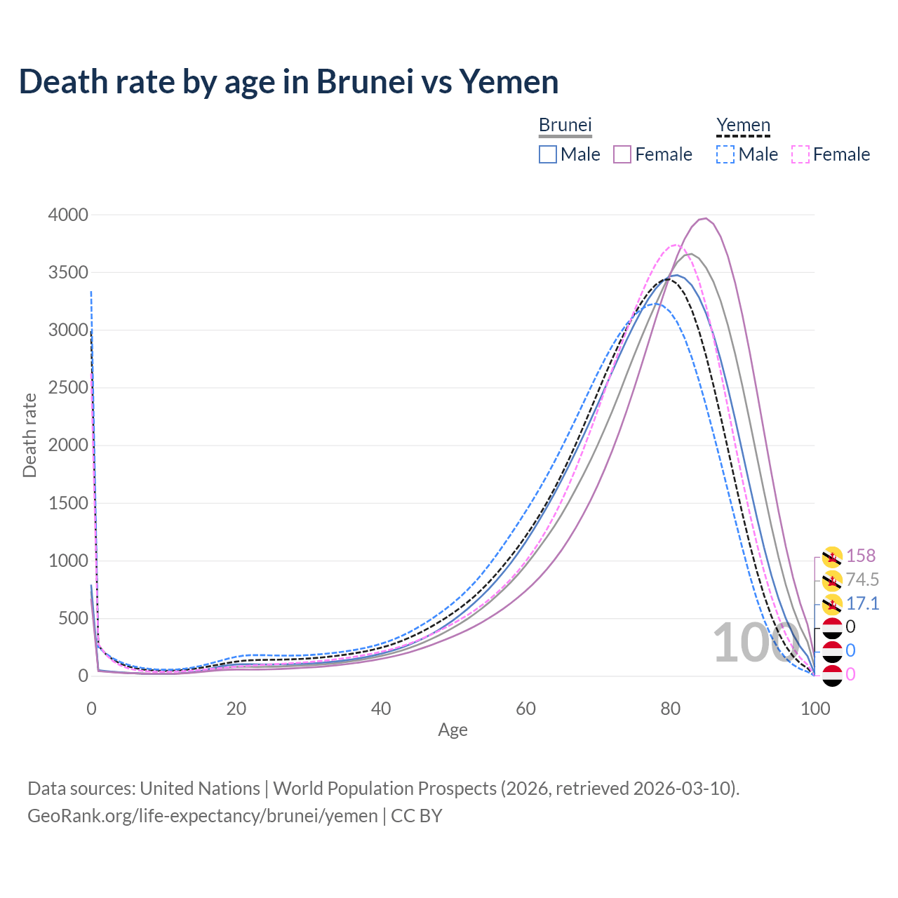 In Brunei, the most common age of death is 83, compared to 80 in Yemen. The median age of death is 79.2 in Brunei and 74.9 in Yemen, meaning only half of each cohort is expected to live past that age.