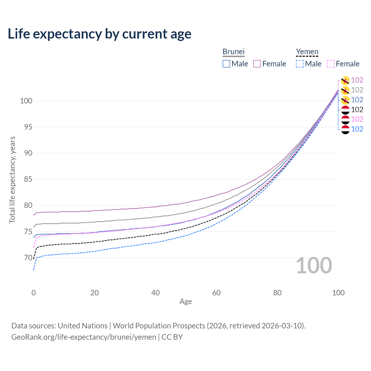 This life expectancy calculator shows the odds of living to 100, 95, 90, and below based on current age for both males and females in Brunei and Yemen, along with mean and median age of death. The calculations are based on the 2026 life tables (actuarial tables) from the UN World Population Prospects.