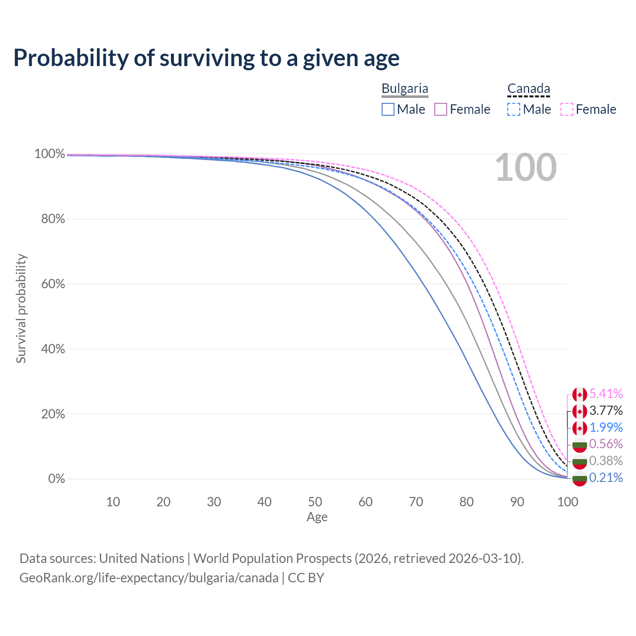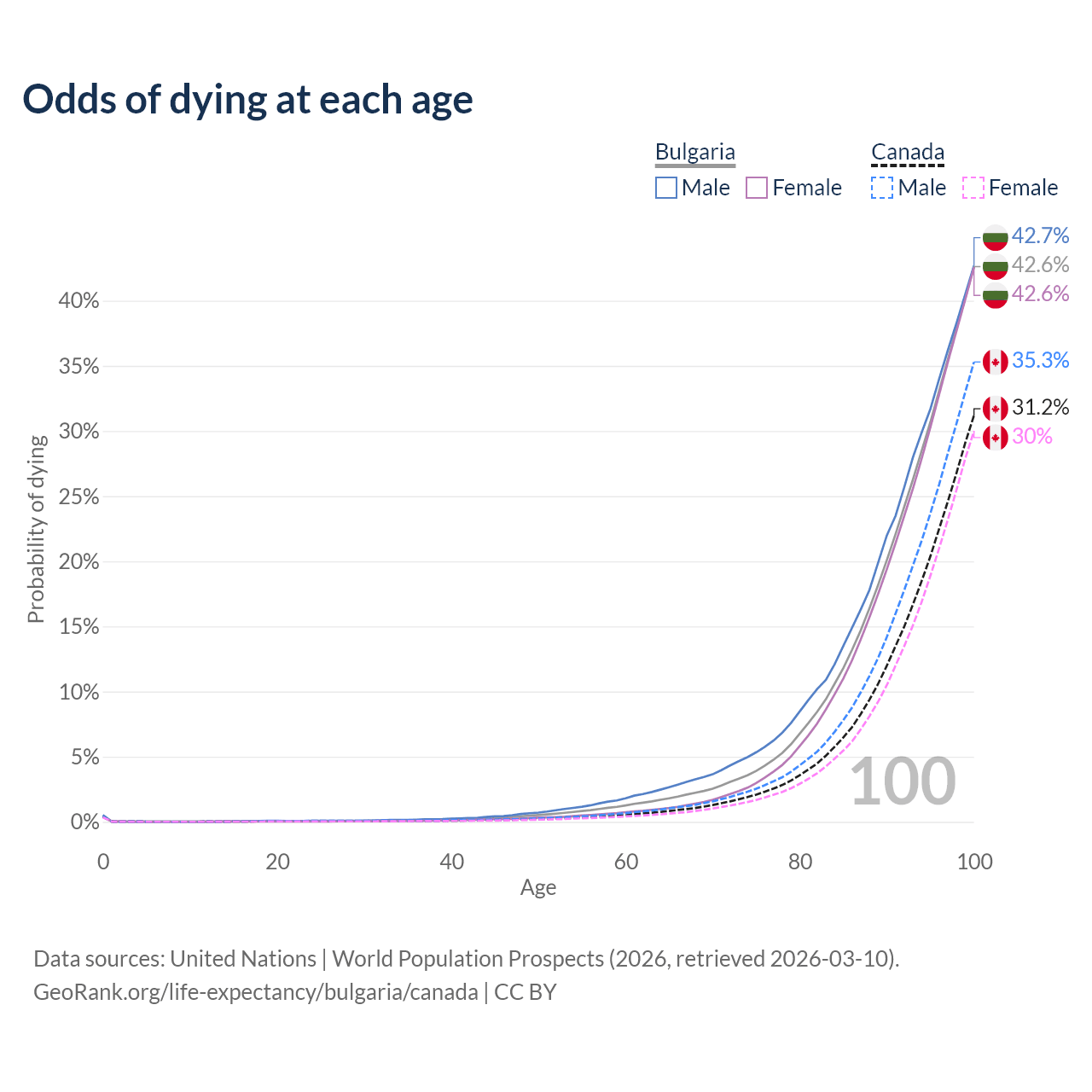 This life expectancy calculator shows the odds of living to 100, 95, 90, and below based on current age for both males and females in Bulgaria and Canada, along with mean and median age of death. The calculations are based on the 2026 life tables (actuarial tables) from the UN World Population Prospects.