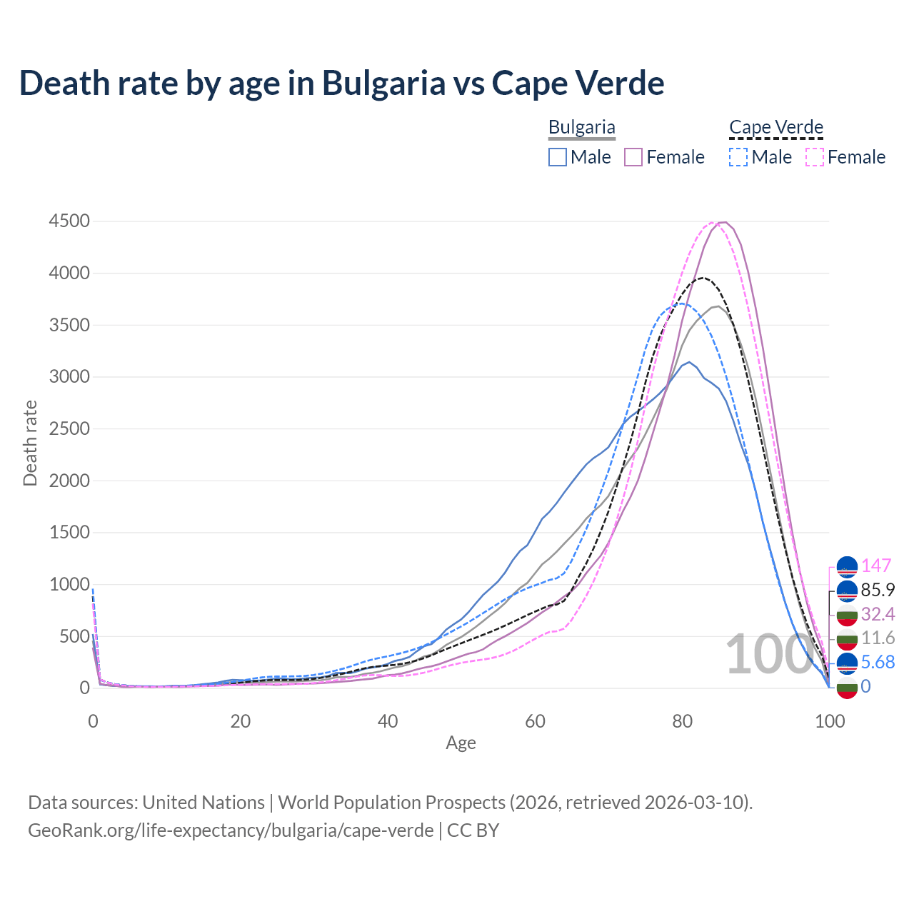 In Bulgaria, the most common age of death is 85, compared to 83 in Cape Verde. The median age of death is 79.5 in Bulgaria and 80.1 in Cape Verde, meaning only half of each cohort is expected to live past that age.