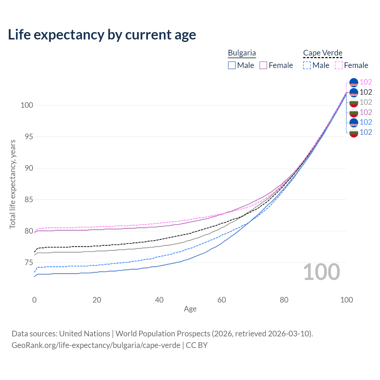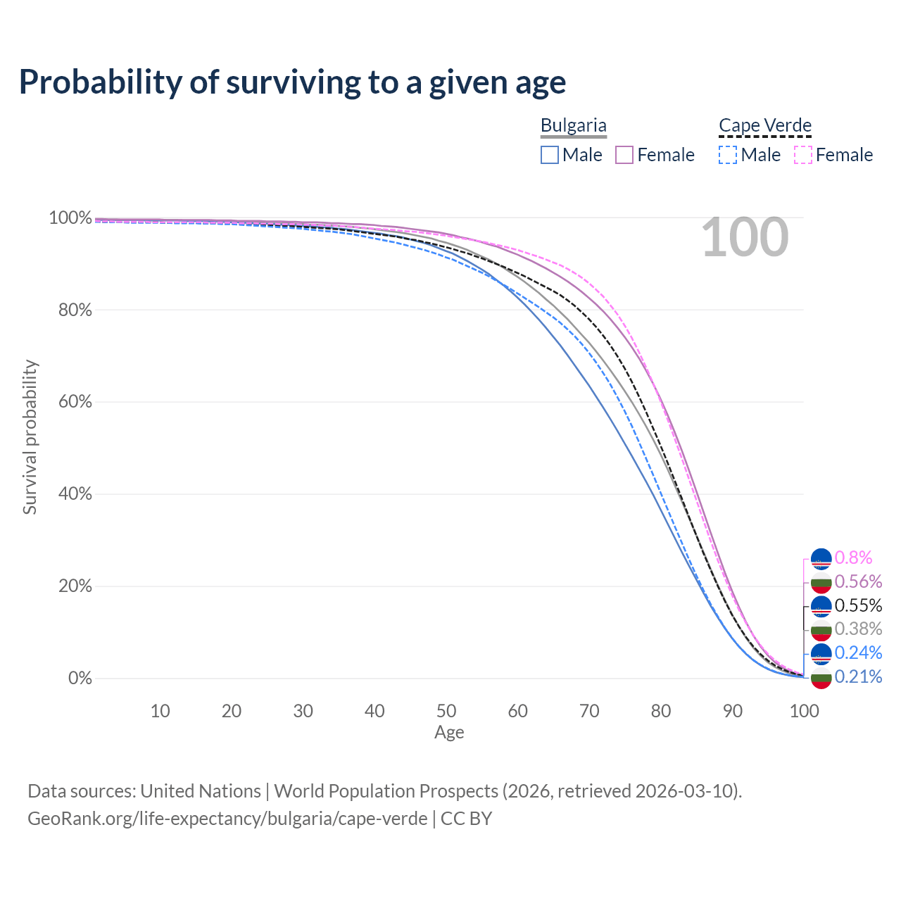 This life expectancy calculator shows the odds of living to 100, 95, 90, and below based on current age for both males and females in Bulgaria and Cape Verde, along with mean and median age of death. The calculations are based on the 2026 life tables (actuarial tables) from the UN World Population Prospects.