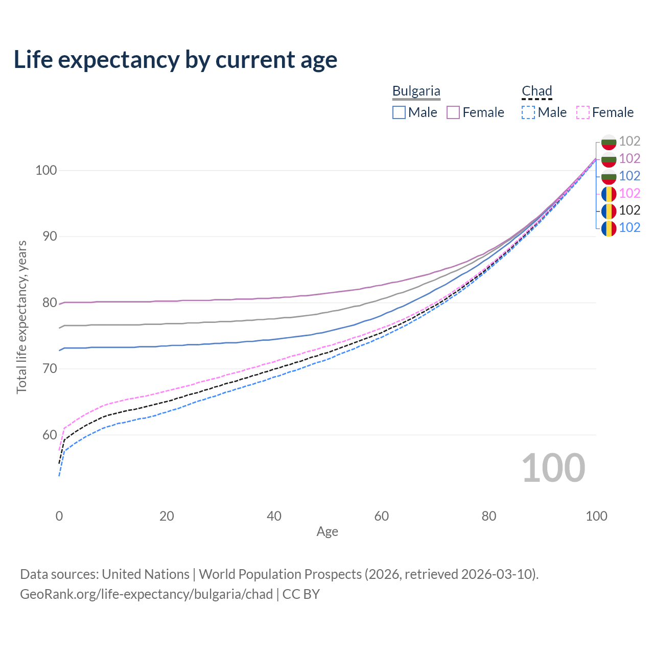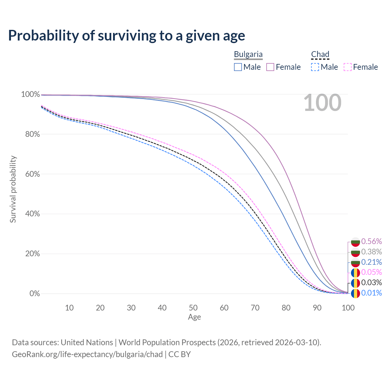 This life expectancy calculator shows the odds of living to 100, 95, 90, and below based on current age for both males and females in Bulgaria and Chad, along with mean and median age of death. The calculations are based on the 2026 life tables (actuarial tables) from the UN World Population Prospects.