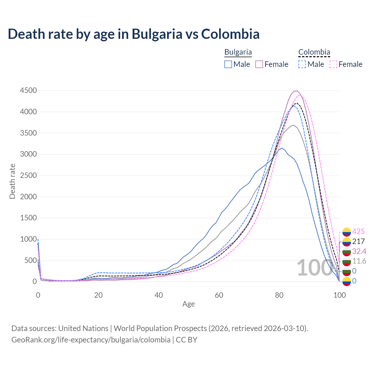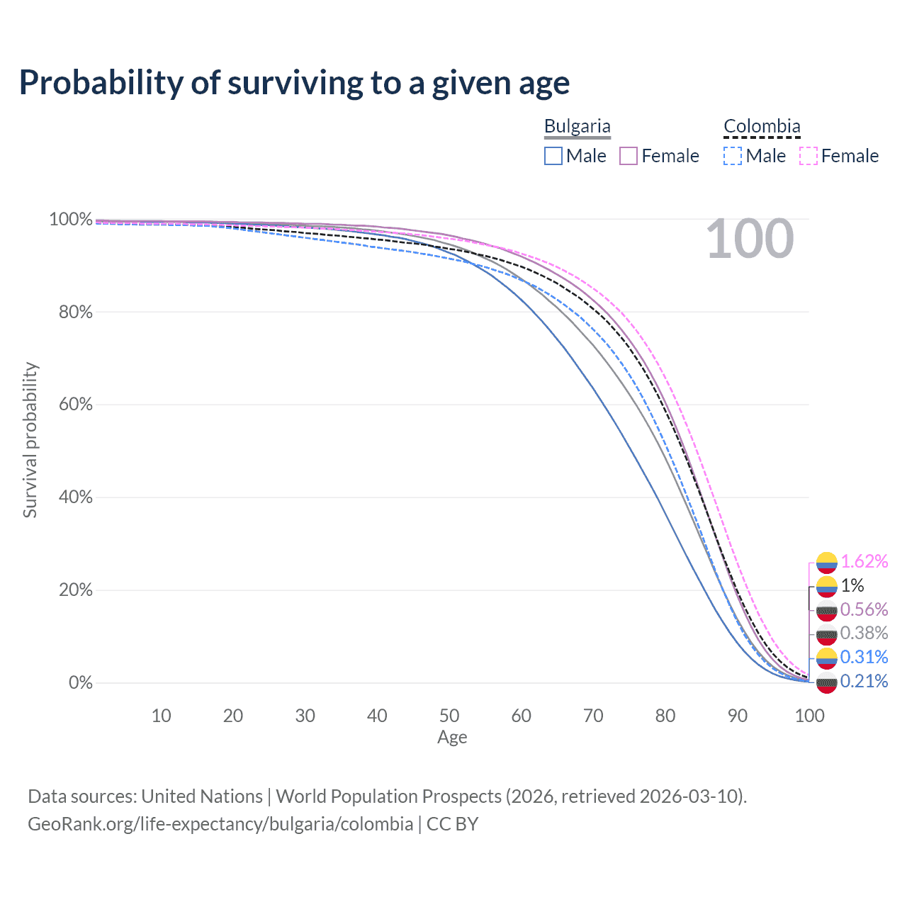 This life expectancy calculator shows the odds of living to 100, 95, 90, and below based on current age for both males and females in Bulgaria and Colombia, along with mean and median age of death. The calculations are based on the 2026 life tables (actuarial tables) from the UN World Population Prospects.