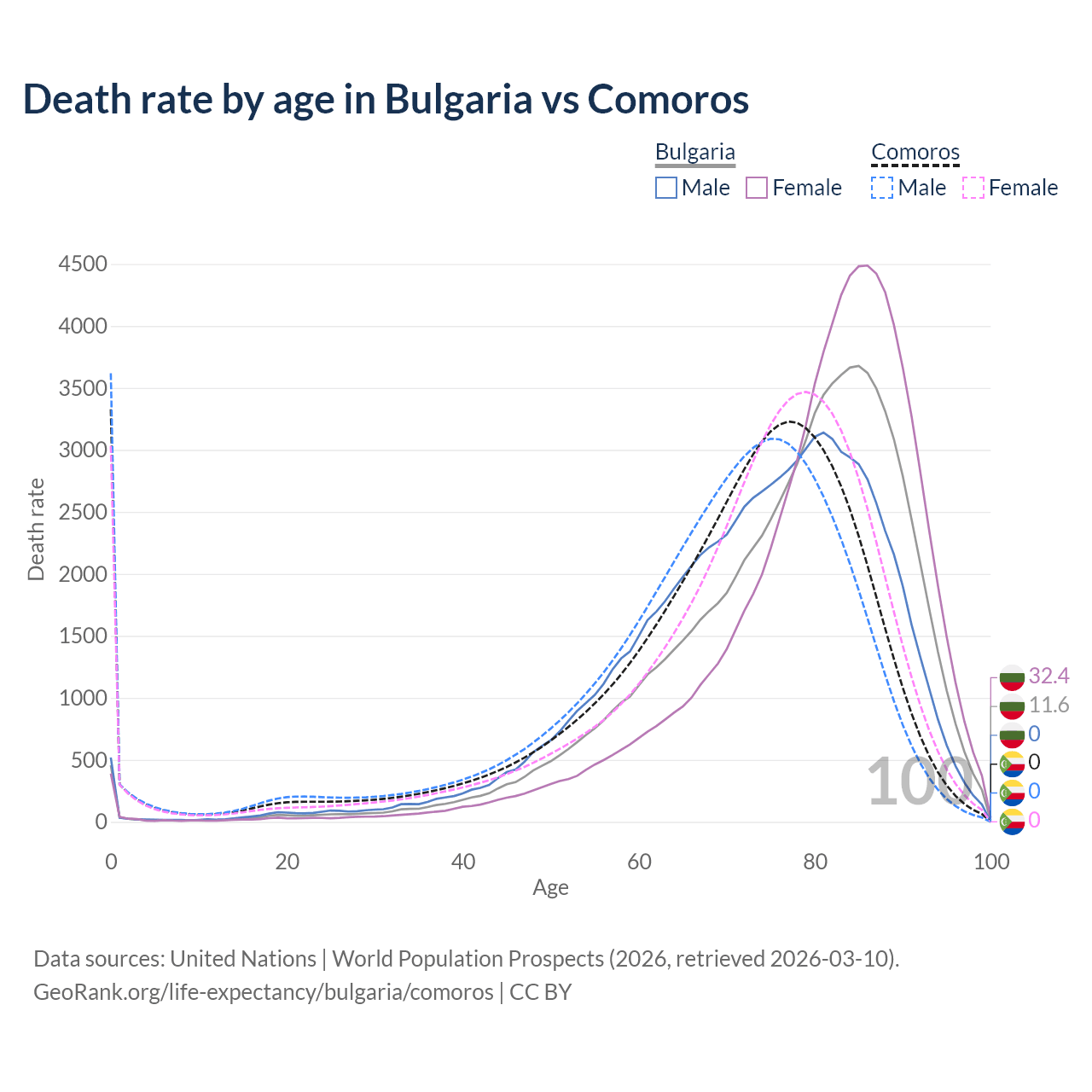 In Bulgaria, the most common age of death is 85, compared to 0 in Comoros. The median age of death is 79.5 in Bulgaria and 72.9 in Comoros, meaning only half of each cohort is expected to live past that age.