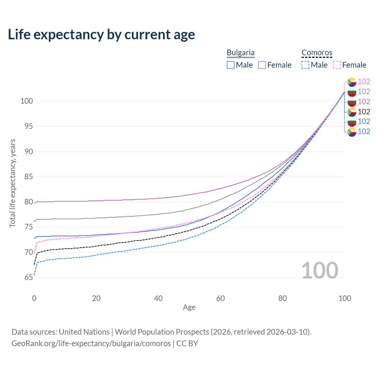 This life expectancy calculator shows the odds of living to 100, 95, 90, and below based on current age for both males and females in Bulgaria and Comoros, along with mean and median age of death. The calculations are based on the 2026 life tables (actuarial tables) from the UN World Population Prospects.