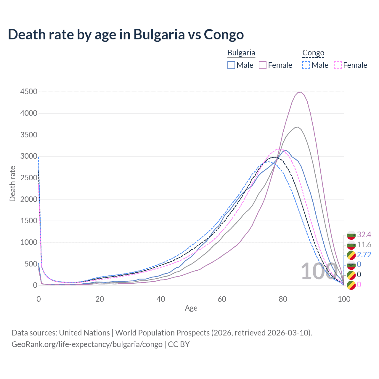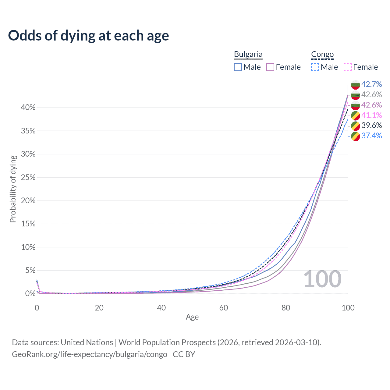 This life expectancy calculator shows the odds of living to 100, 95, 90, and below based on current age for both males and females in Bulgaria and the Congo, along with mean and median age of death. The calculations are based on the 2026 life tables (actuarial tables) from the UN World Population Prospects.