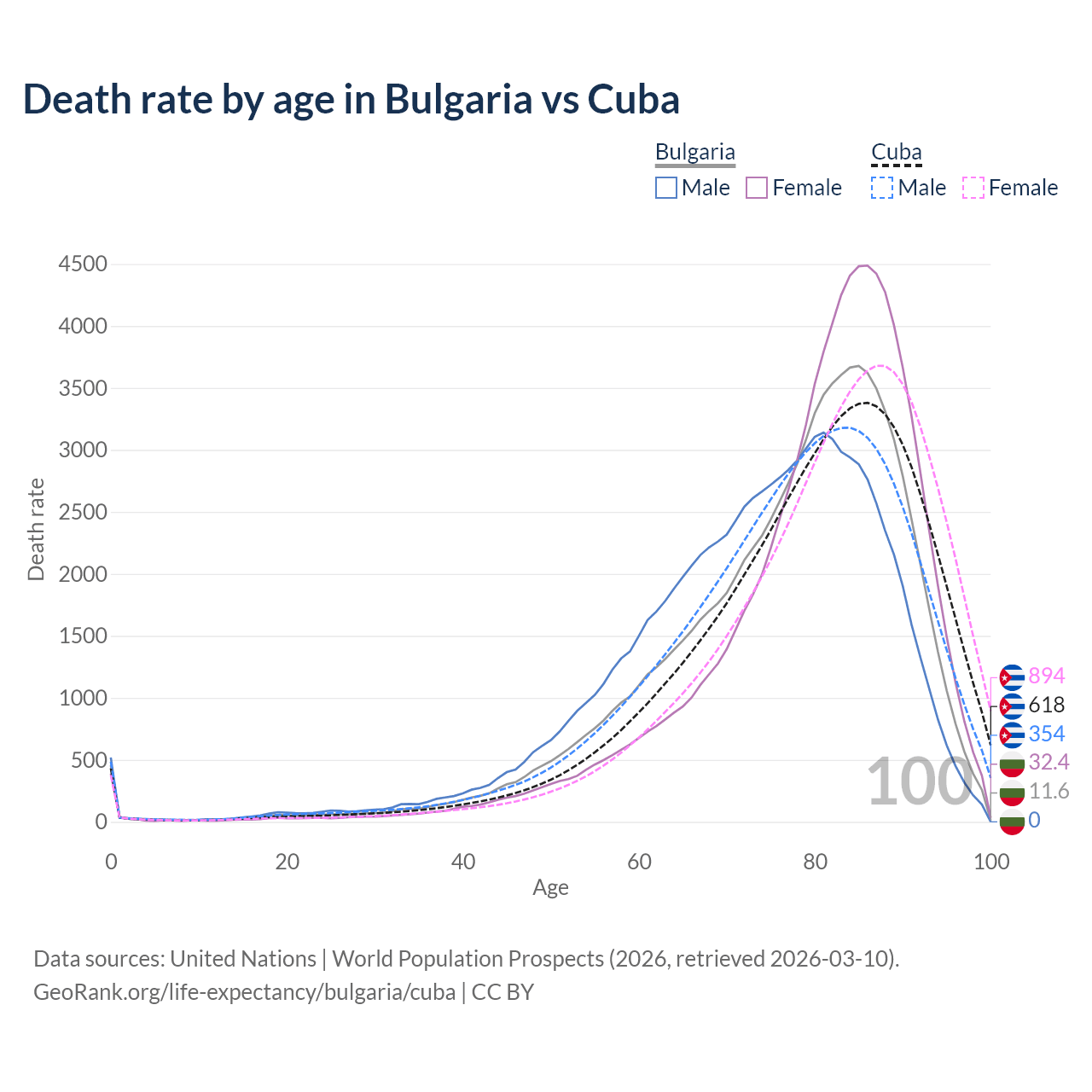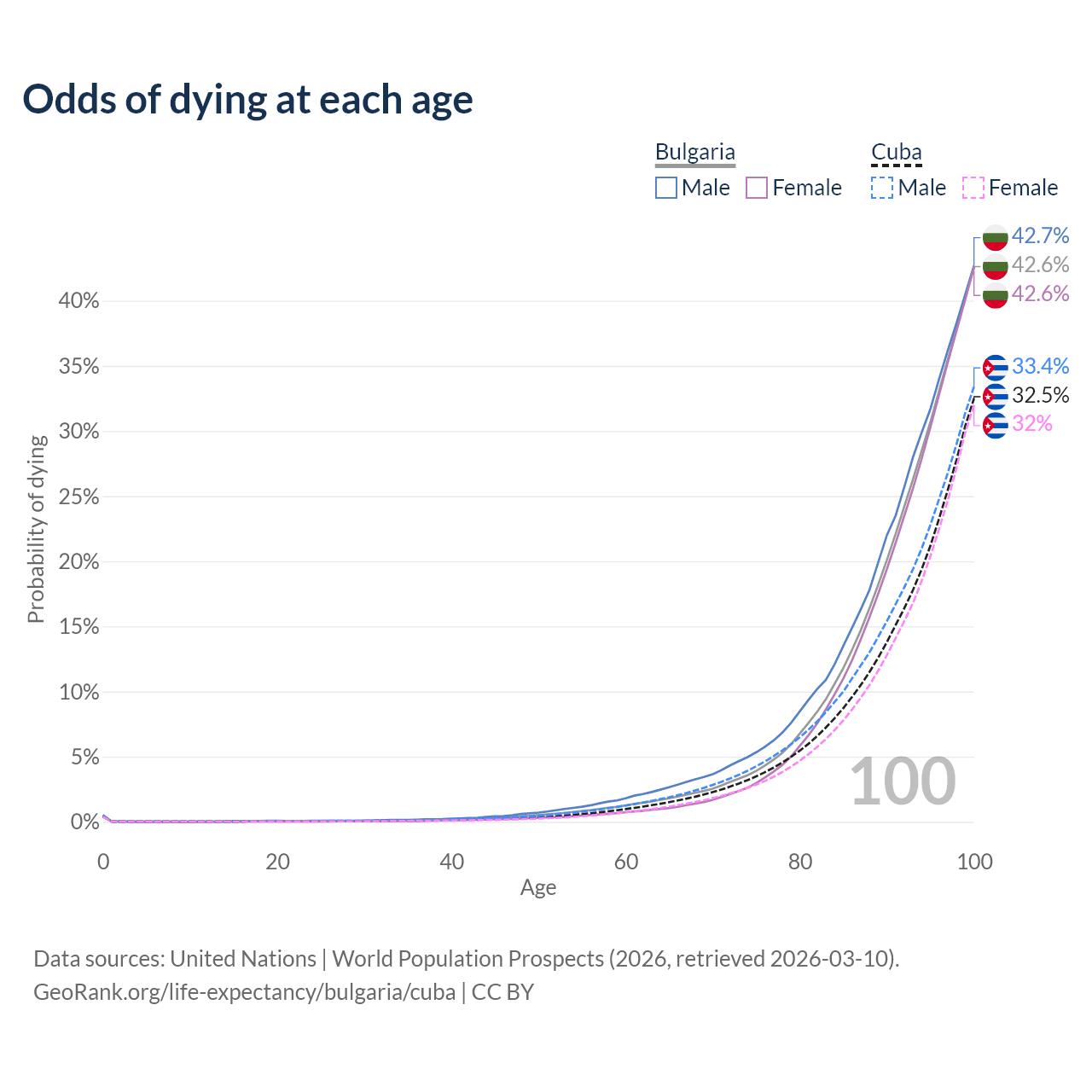 This life expectancy calculator shows the odds of living to 100, 95, 90, and below based on current age for both males and females in Bulgaria and Cuba, along with mean and median age of death. The calculations are based on the 2026 life tables (actuarial tables) from the UN World Population Prospects.