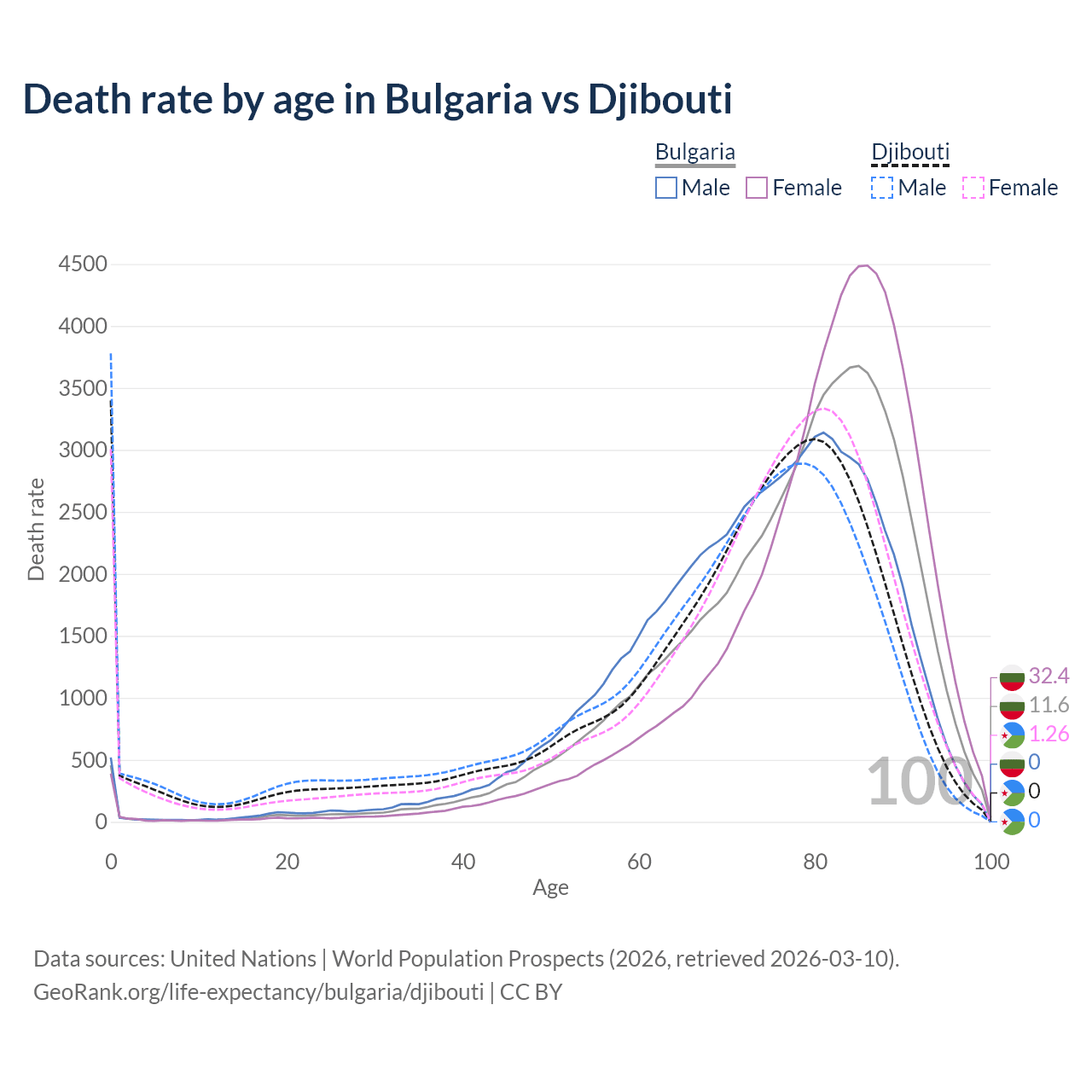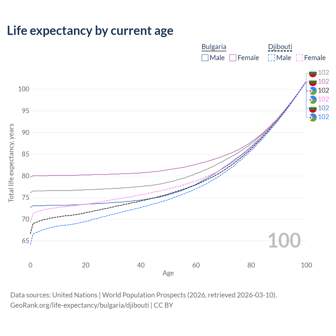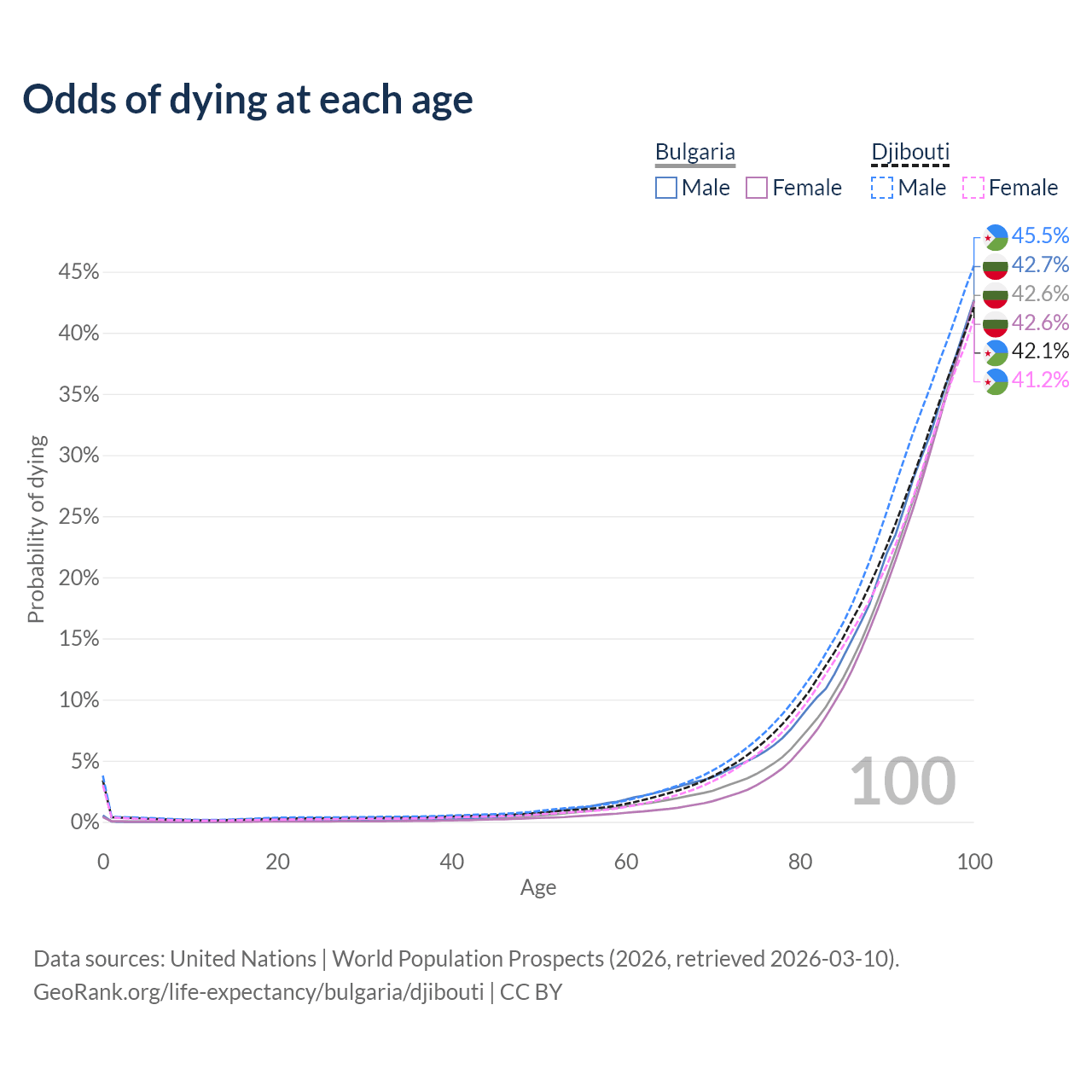 This life expectancy calculator shows the odds of living to 100, 95, 90, and below based on current age for both males and females in Bulgaria and Djibouti, along with mean and median age of death. The calculations are based on the 2026 life tables (actuarial tables) from the UN World Population Prospects.
