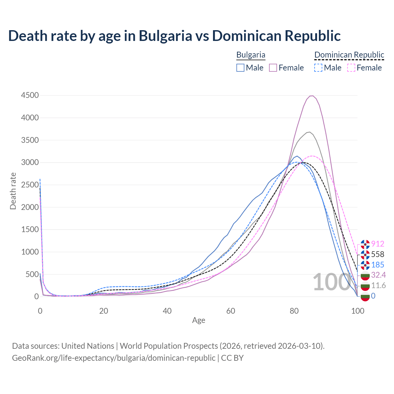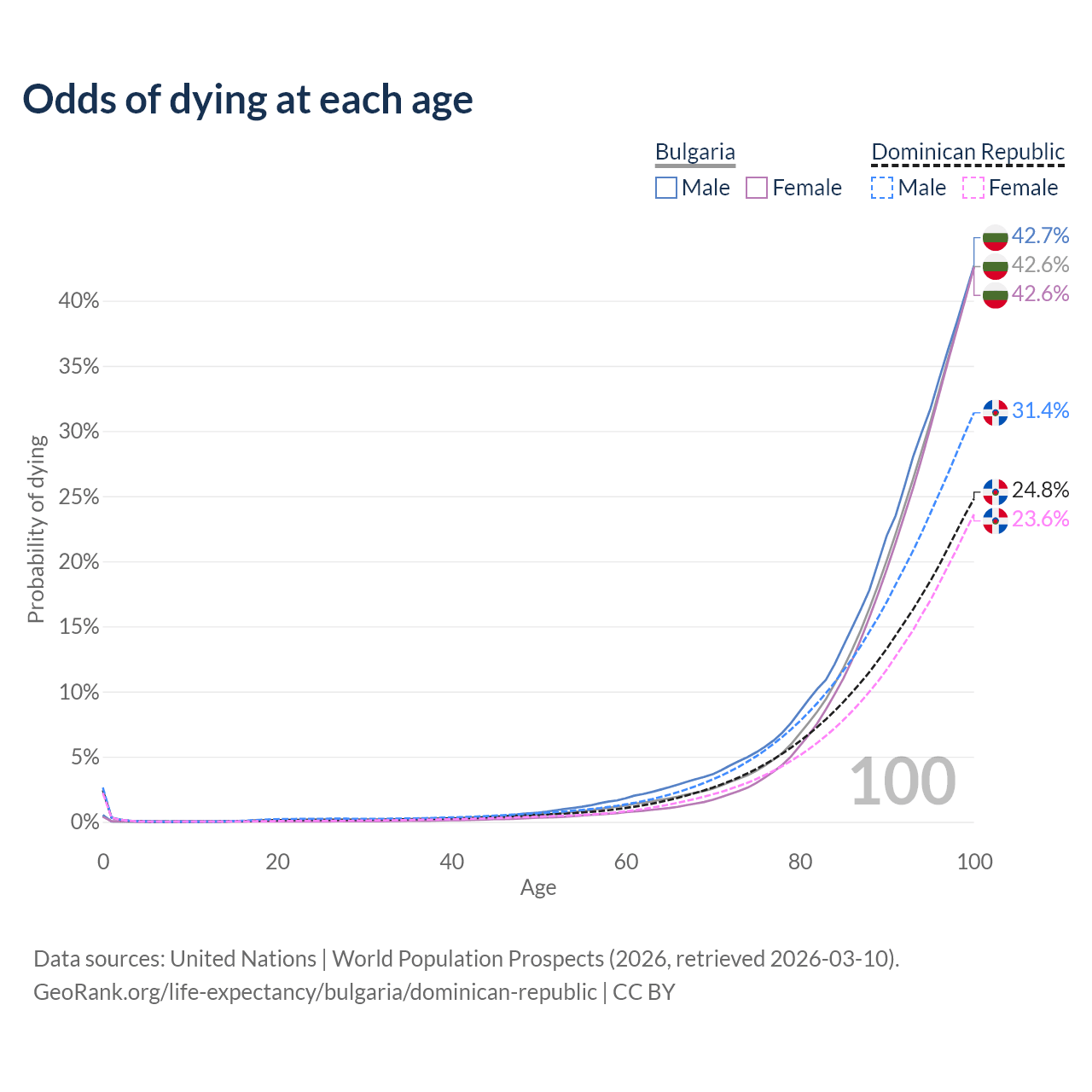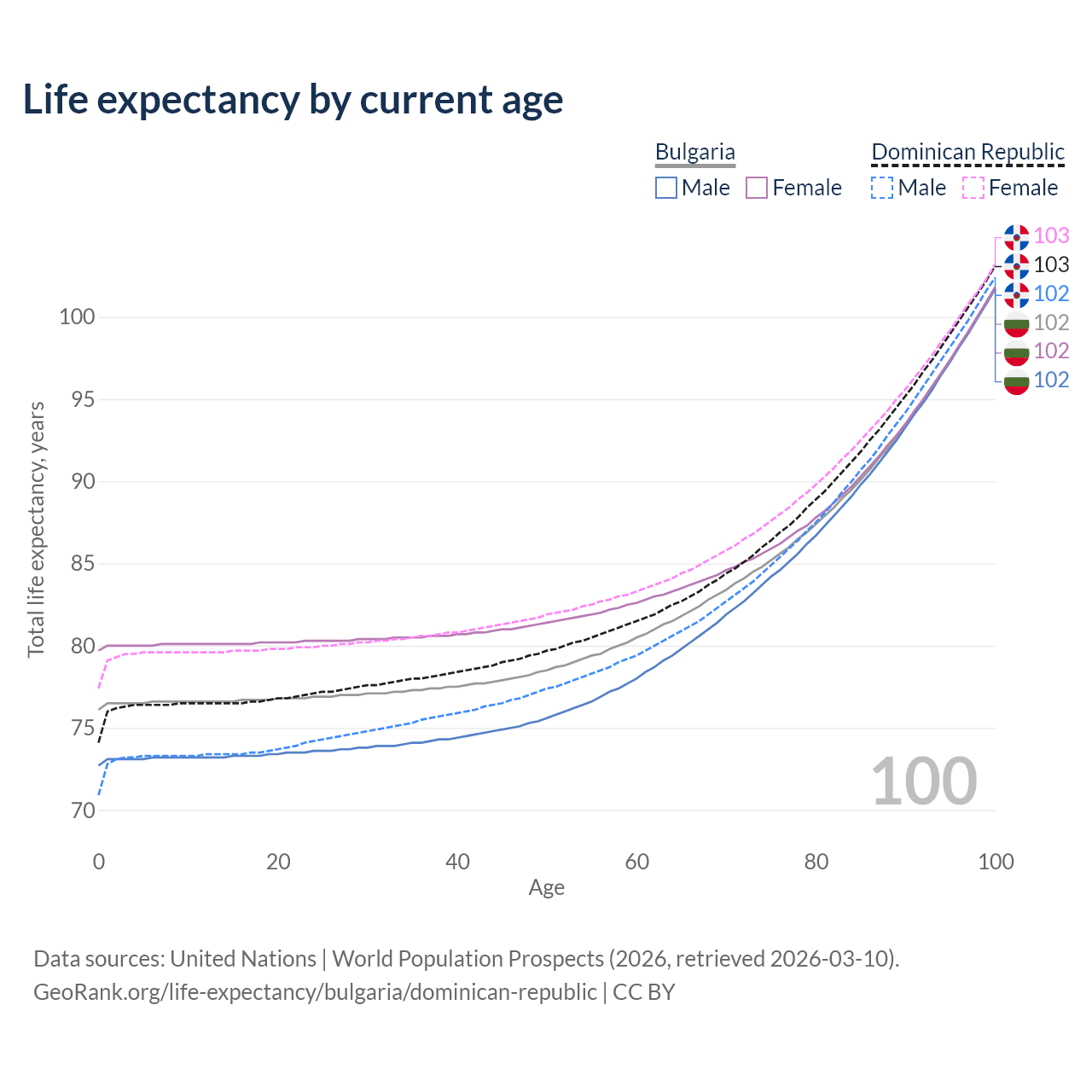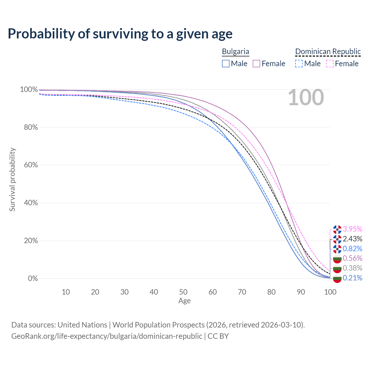 This life expectancy calculator shows the odds of living to 100, 95, 90, and below based on current age for both males and females in Bulgaria and the Dominican Republic, along with mean and median age of death. The calculations are based on the 2026 life tables (actuarial tables) from the UN World Population Prospects.