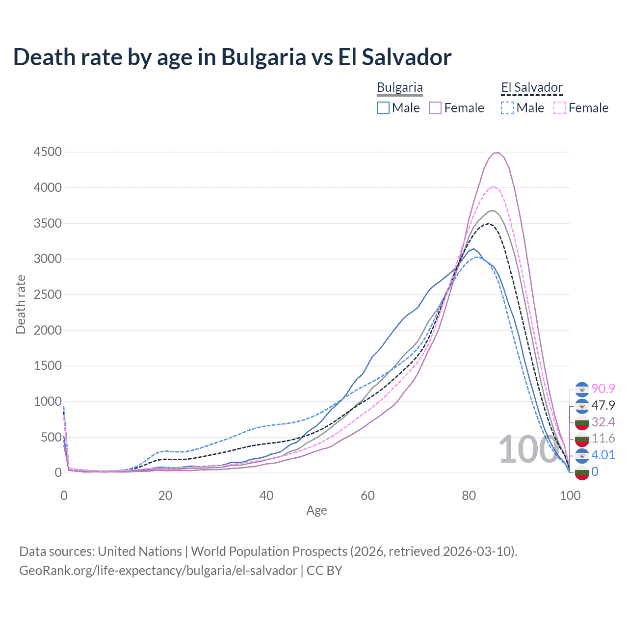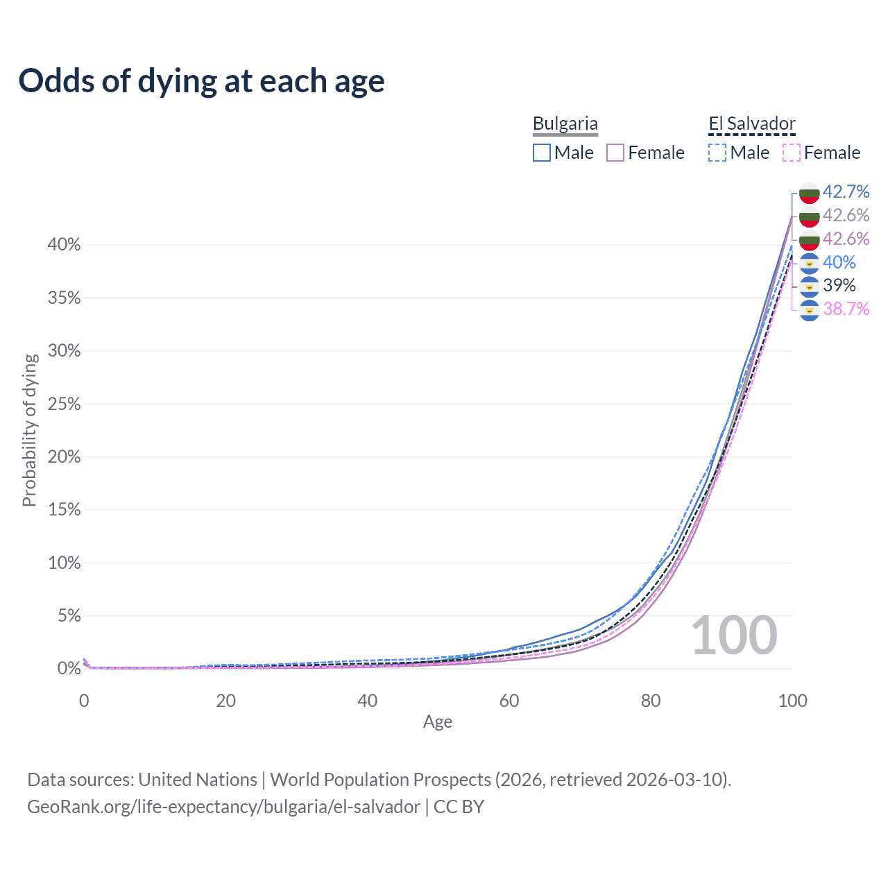 This life expectancy calculator shows the odds of living to 100, 95, 90, and below based on current age for both males and females in Bulgaria and El Salvador, along with mean and median age of death. The calculations are based on the 2026 life tables (actuarial tables) from the UN World Population Prospects.
