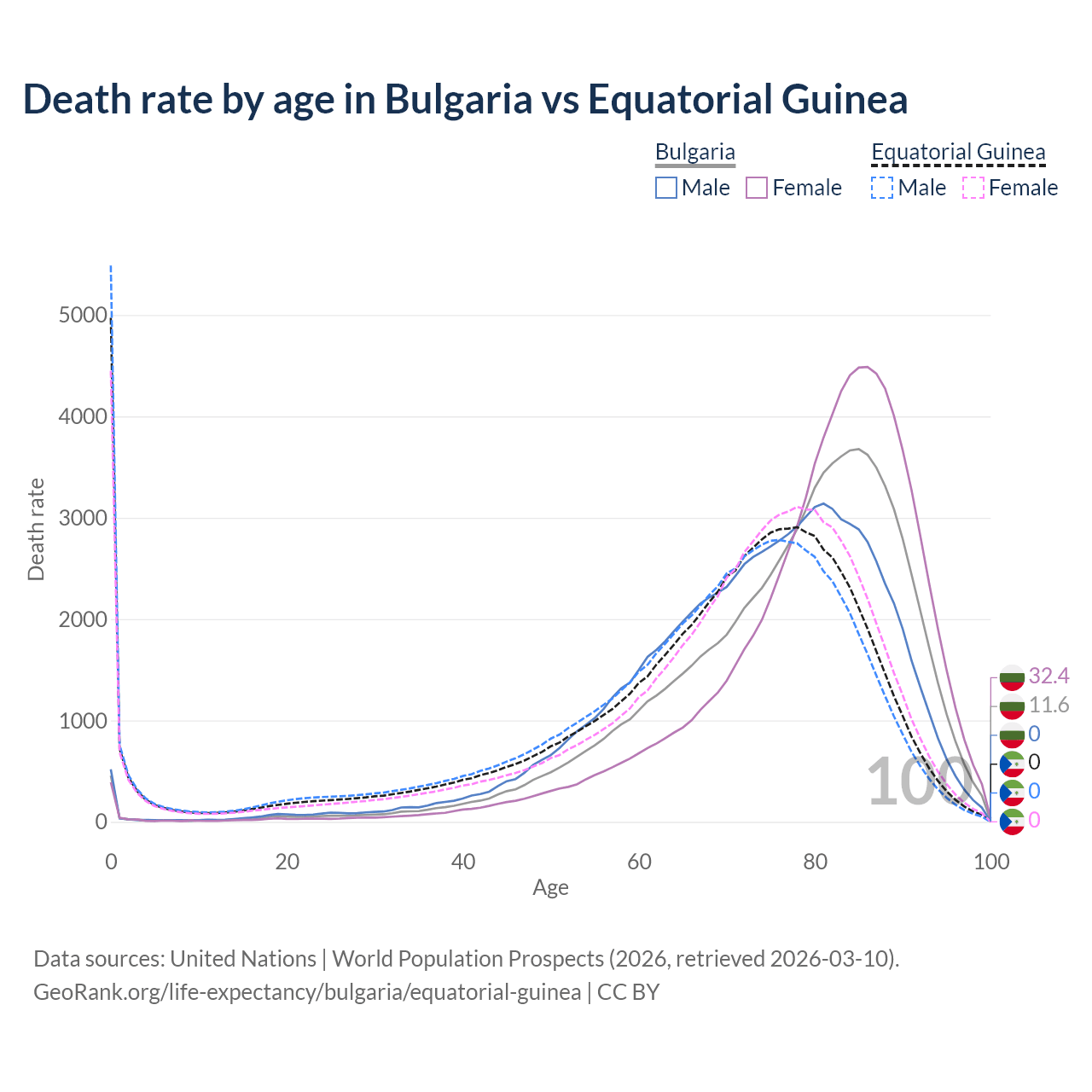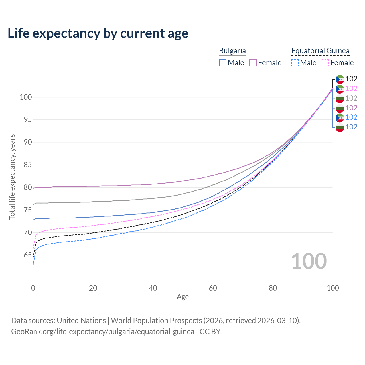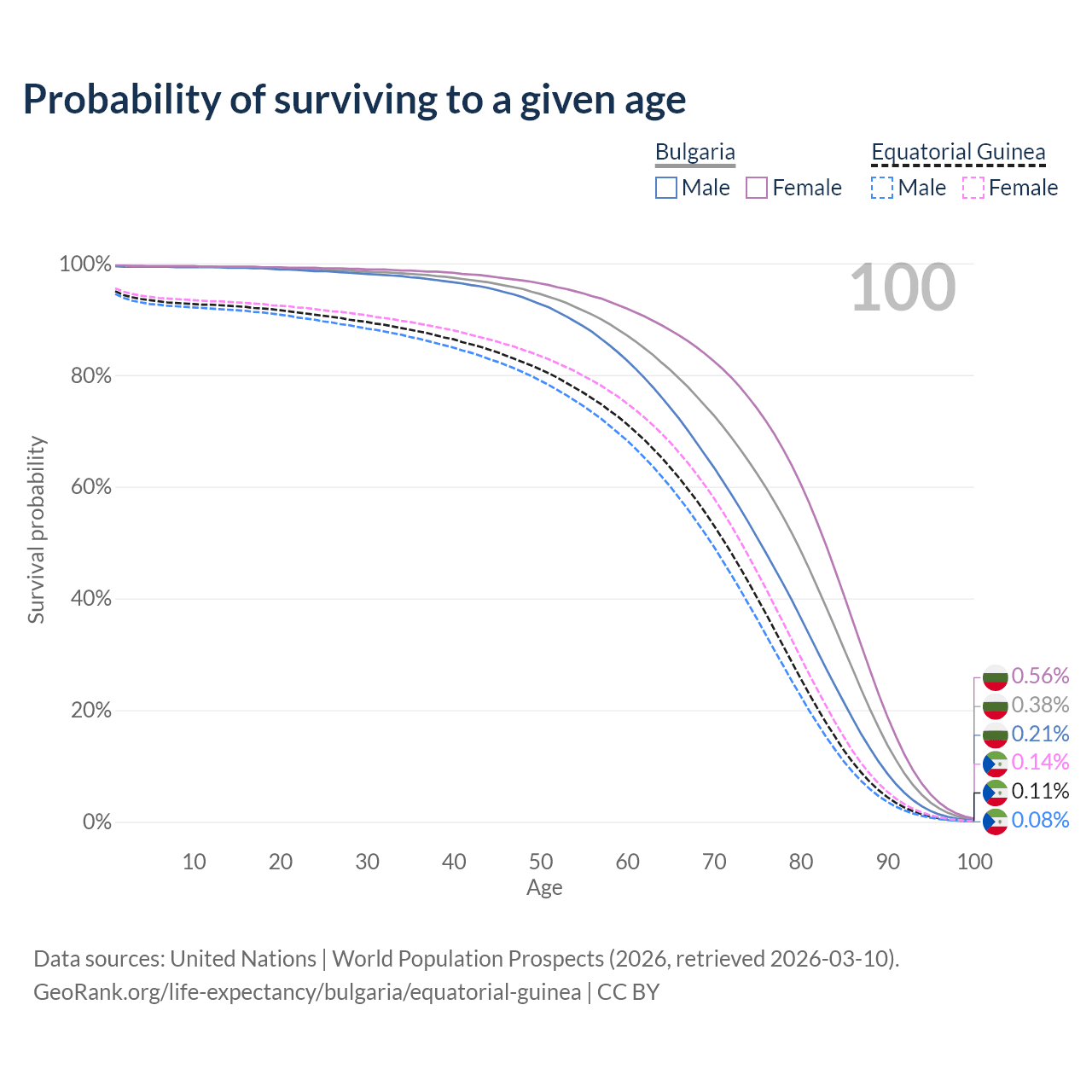 This life expectancy calculator shows the odds of living to 100, 95, 90, and below based on current age for both males and females in Bulgaria and Equatorial Guinea, along with mean and median age of death. The calculations are based on the 2026 life tables (actuarial tables) from the UN World Population Prospects.