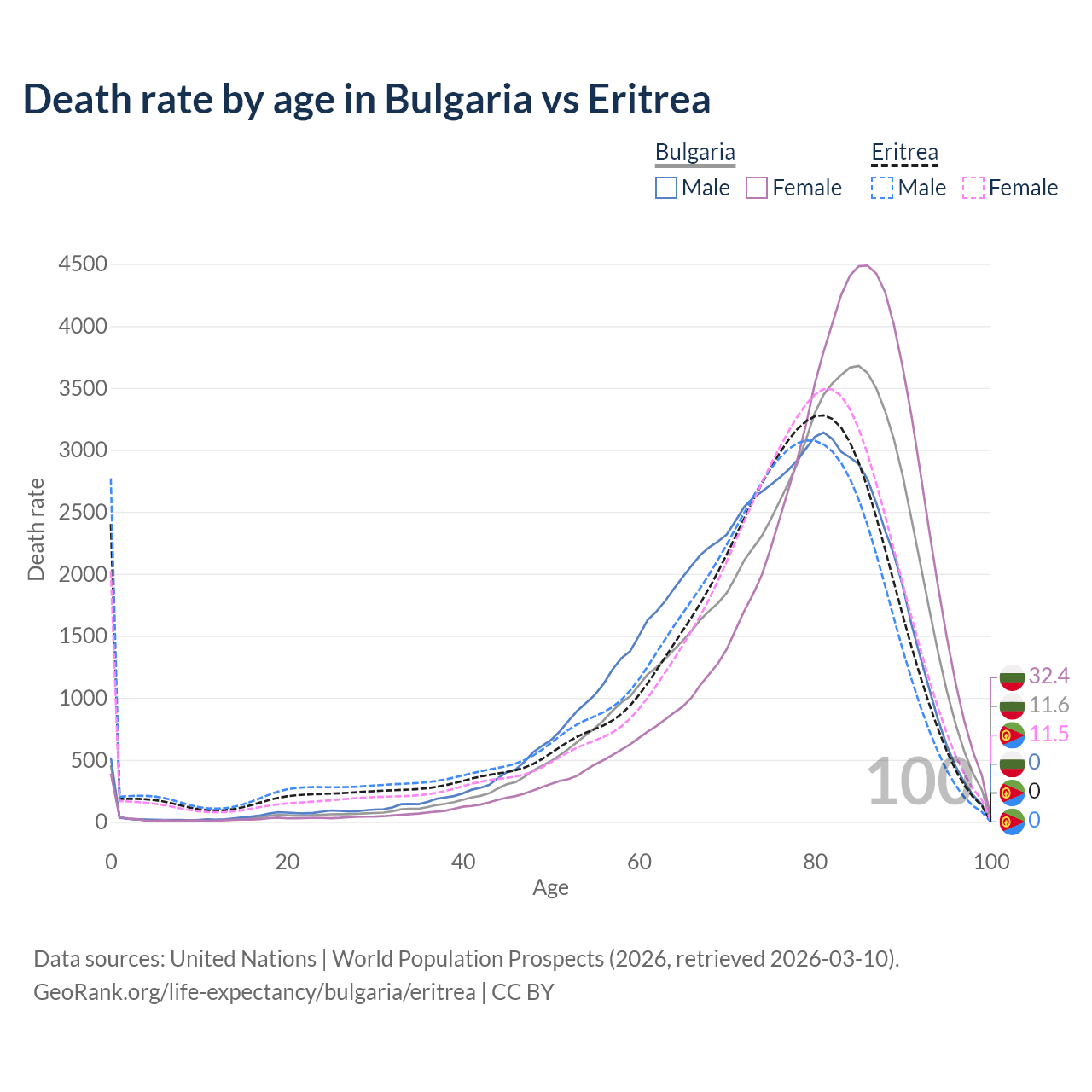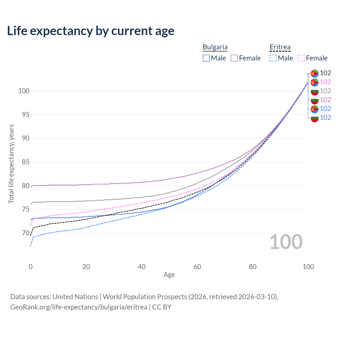 This life expectancy calculator shows the odds of living to 100, 95, 90, and below based on current age for both males and females in Bulgaria and Eritrea, along with mean and median age of death. The calculations are based on the 2026 life tables (actuarial tables) from the UN World Population Prospects.