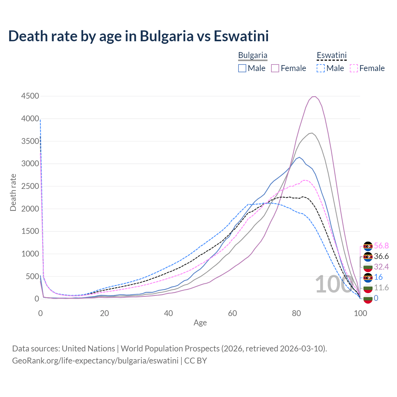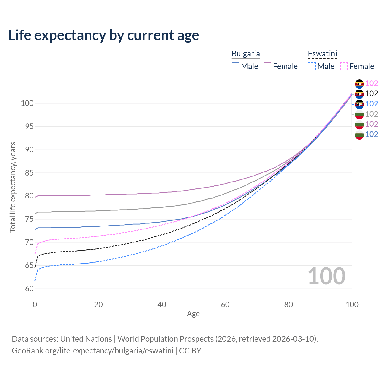 This life expectancy calculator shows the odds of living to 100, 95, 90, and below based on current age for both males and females in Bulgaria and Eswatini, along with mean and median age of death. The calculations are based on the 2026 life tables (actuarial tables) from the UN World Population Prospects.