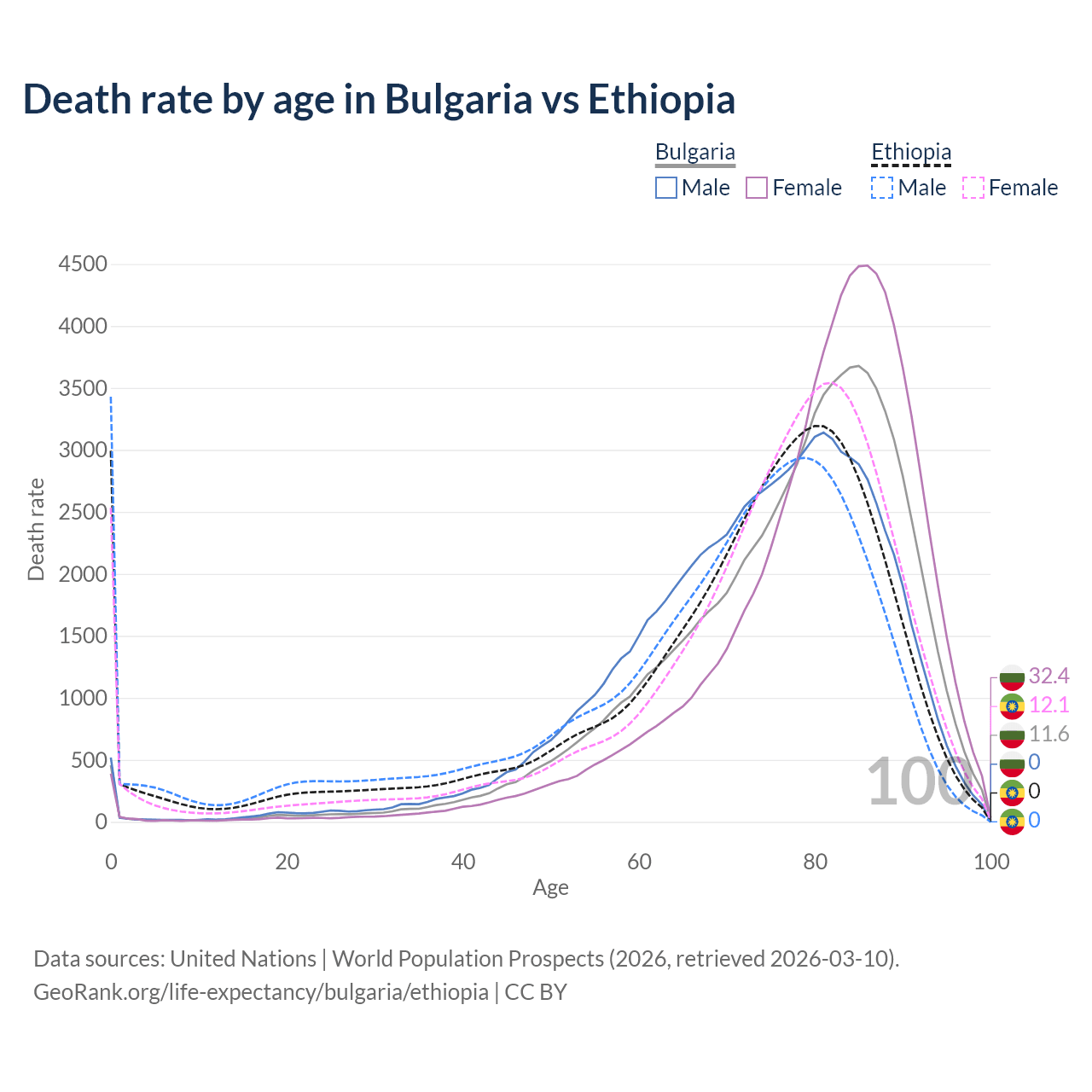 This life expectancy calculator shows the odds of living to 100, 95, 90, and below based on current age for both males and females in Bulgaria and Ethiopia, along with mean and median age of death. The calculations are based on the 2026 life tables (actuarial tables) from the UN World Population Prospects.