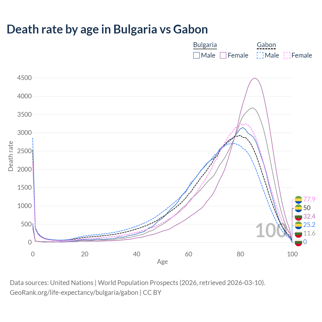 In Bulgaria, the most common age of death is 85, compared to 80 in Gabon. The median age of death is 79.5 in Bulgaria and 73.9 in Gabon, meaning only half of each cohort is expected to live past that age.