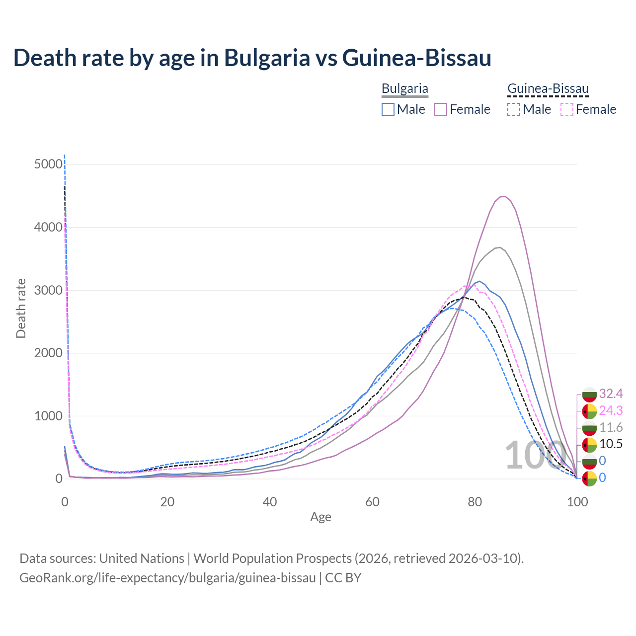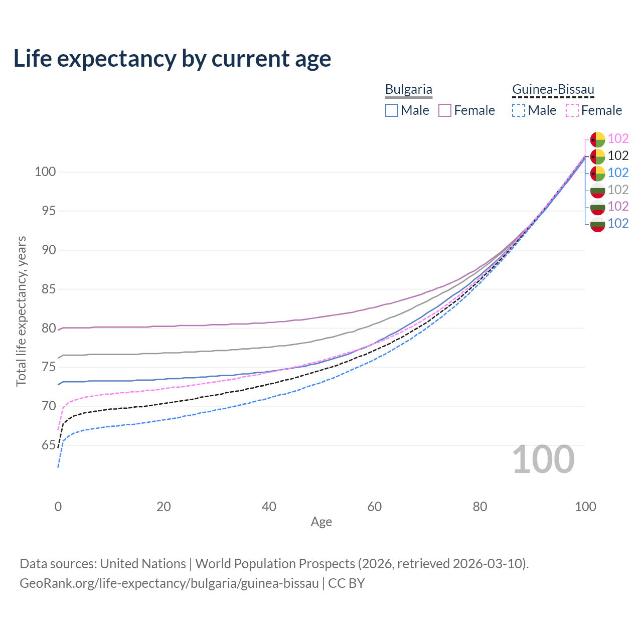This life expectancy calculator shows the odds of living to 100, 95, 90, and below based on current age for both males and females in Bulgaria and Guinea-Bissau, along with mean and median age of death. The calculations are based on the 2026 life tables (actuarial tables) from the UN World Population Prospects.