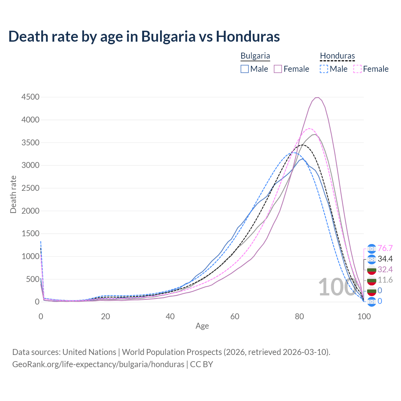 In Bulgaria, the most common age of death is 85, compared to 81 in Honduras. The median age of death is 79.5 in Bulgaria and 77.1 in Honduras, meaning only half of each cohort is expected to live past that age.