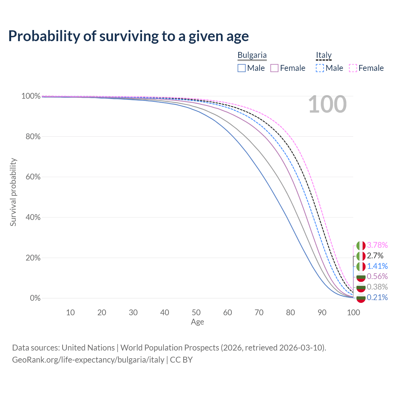 This life expectancy calculator shows the odds of living to 100, 95, 90, and below based on current age for both males and females in Bulgaria and Italy, along with mean and median age of death. The calculations are based on the 2026 life tables (actuarial tables) from the UN World Population Prospects.
