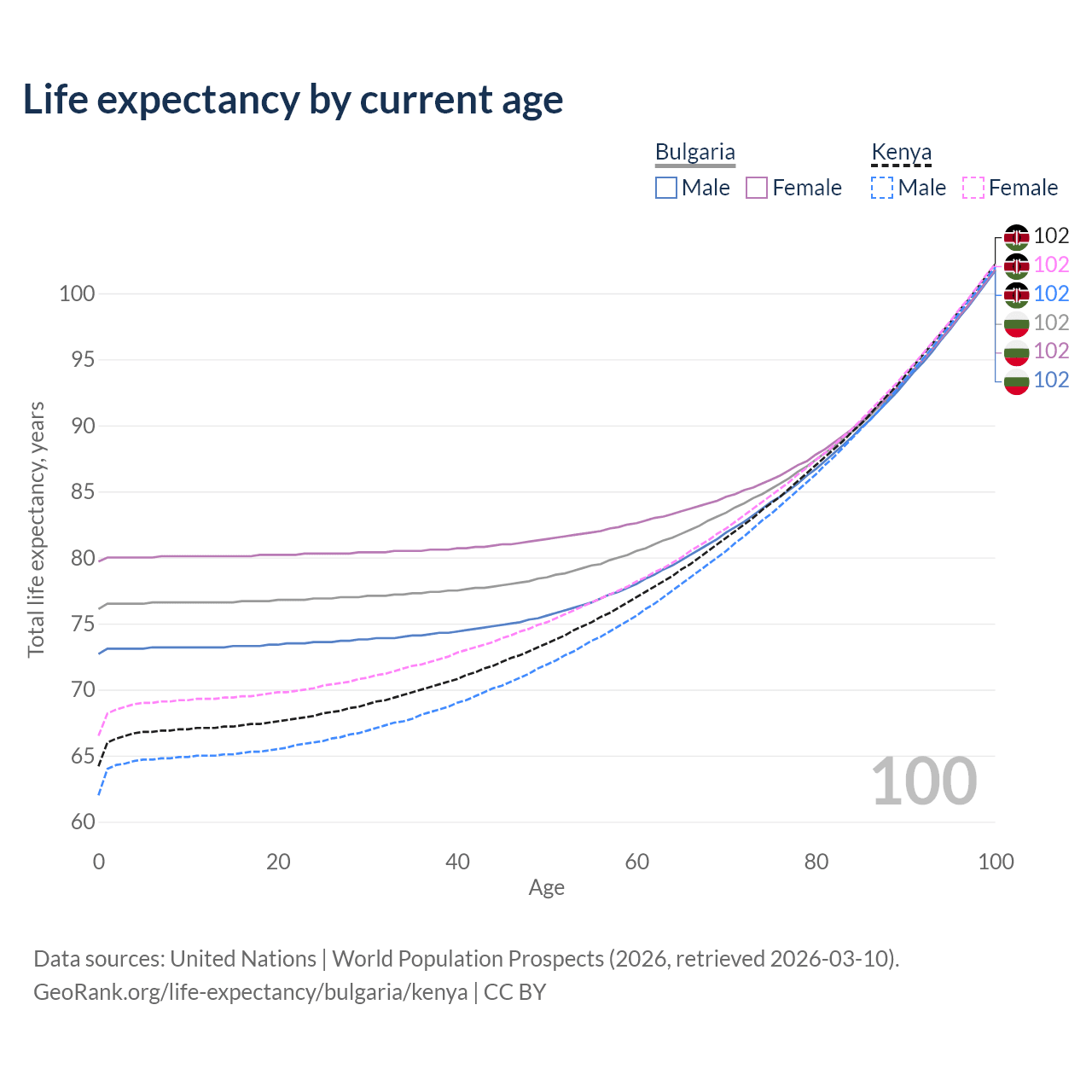 This life expectancy calculator shows the odds of living to 100, 95, 90, and below based on current age for both males and females in Bulgaria and Kenya, along with mean and median age of death. The calculations are based on the 2026 life tables (actuarial tables) from the UN World Population Prospects.