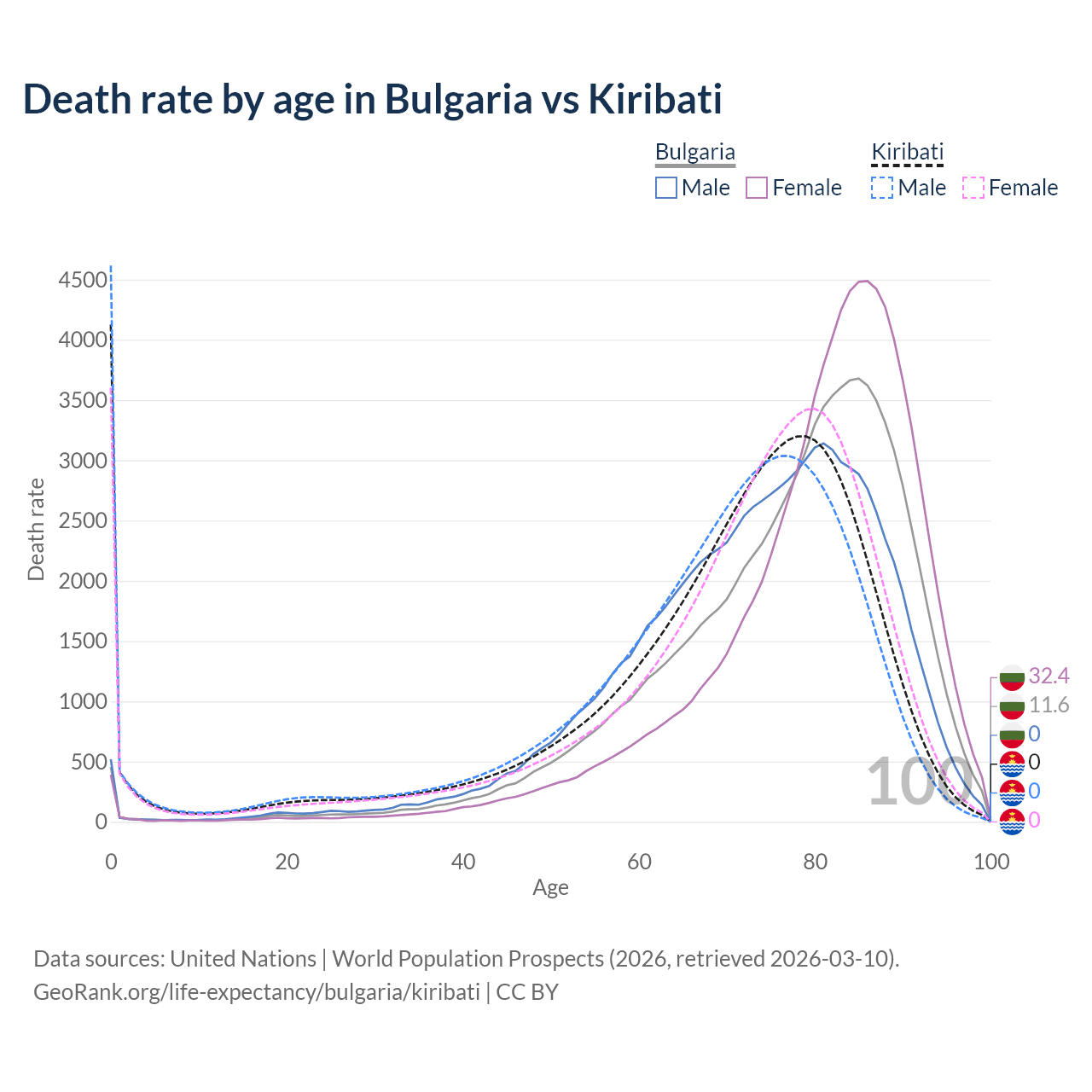 This life expectancy calculator shows the odds of living to 100, 95, 90, and below based on current age for both males and females in Bulgaria and Kiribati, along with mean and median age of death. The calculations are based on the 2026 life tables (actuarial tables) from the UN World Population Prospects.