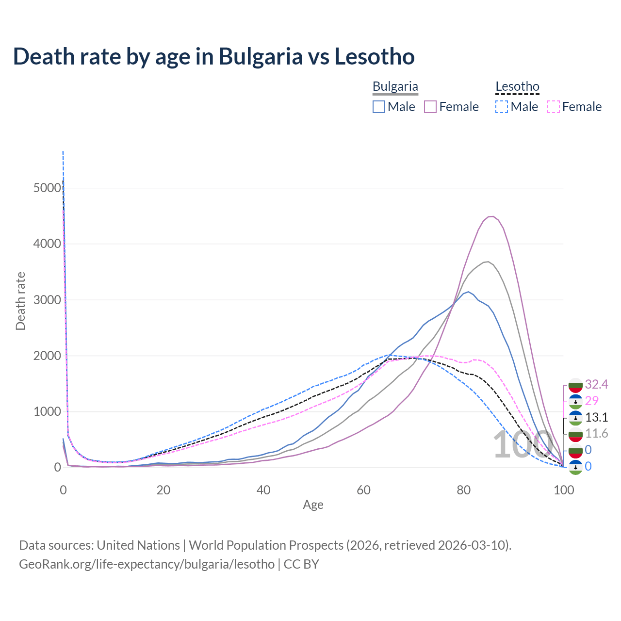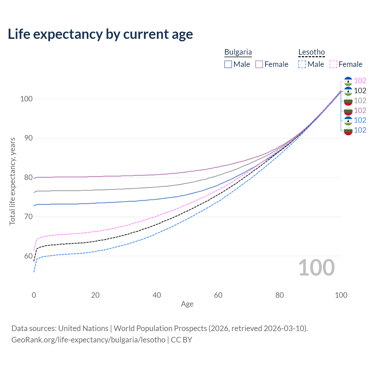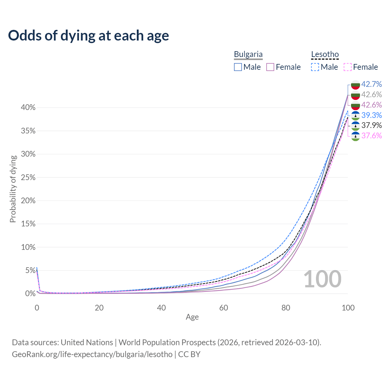 This life expectancy calculator shows the odds of living to 100, 95, 90, and below based on current age for both males and females in Bulgaria and Lesotho, along with mean and median age of death. The calculations are based on the 2026 life tables (actuarial tables) from the UN World Population Prospects.