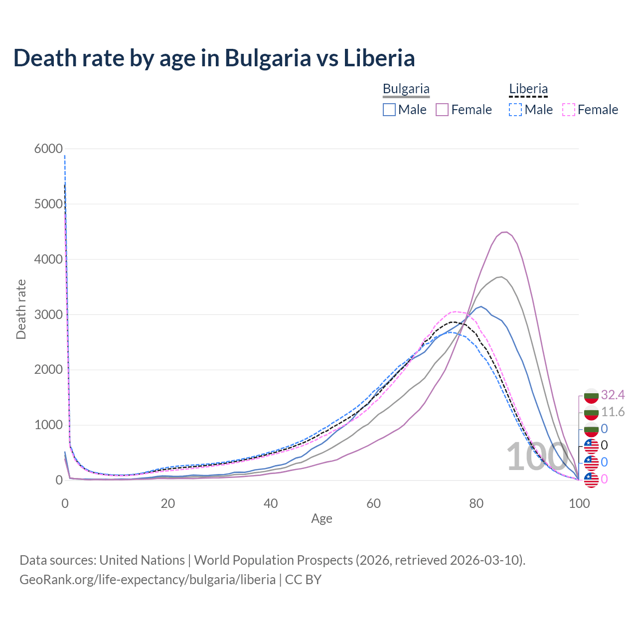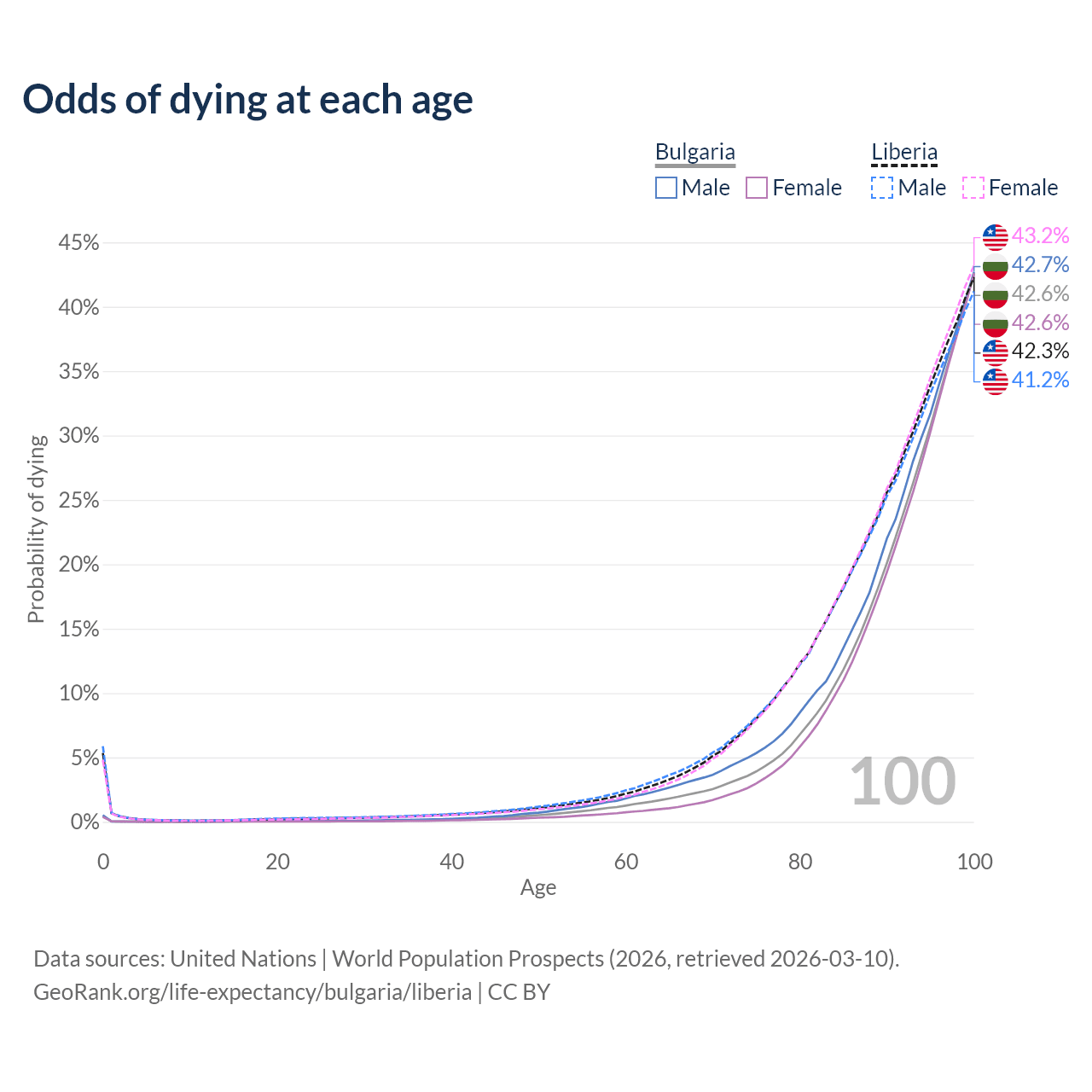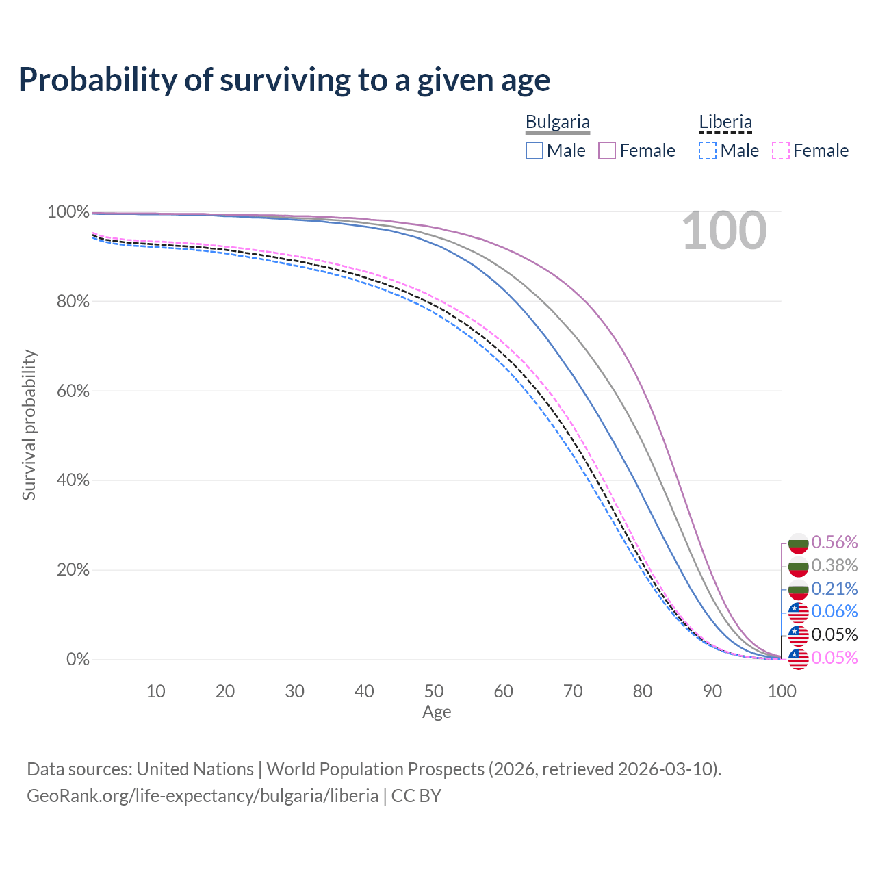 This life expectancy calculator shows the odds of living to 100, 95, 90, and below based on current age for both males and females in Bulgaria and Liberia, along with mean and median age of death. The calculations are based on the 2026 life tables (actuarial tables) from the UN World Population Prospects.