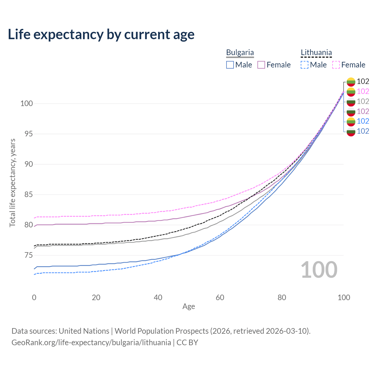This life expectancy calculator shows the odds of living to 100, 95, 90, and below based on current age for both males and females in Bulgaria and Lithuania, along with mean and median age of death. The calculations are based on the 2026 life tables (actuarial tables) from the UN World Population Prospects.