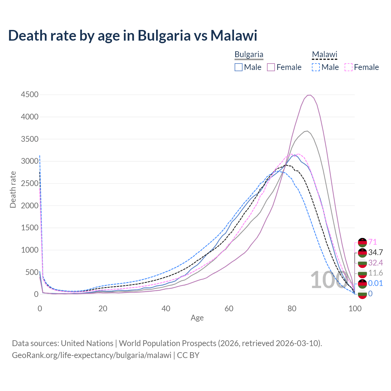This life expectancy calculator shows the odds of living to 100, 95, 90, and below based on current age for both males and females in Bulgaria and Malawi, along with mean and median age of death. The calculations are based on the 2026 life tables (actuarial tables) from the UN World Population Prospects.