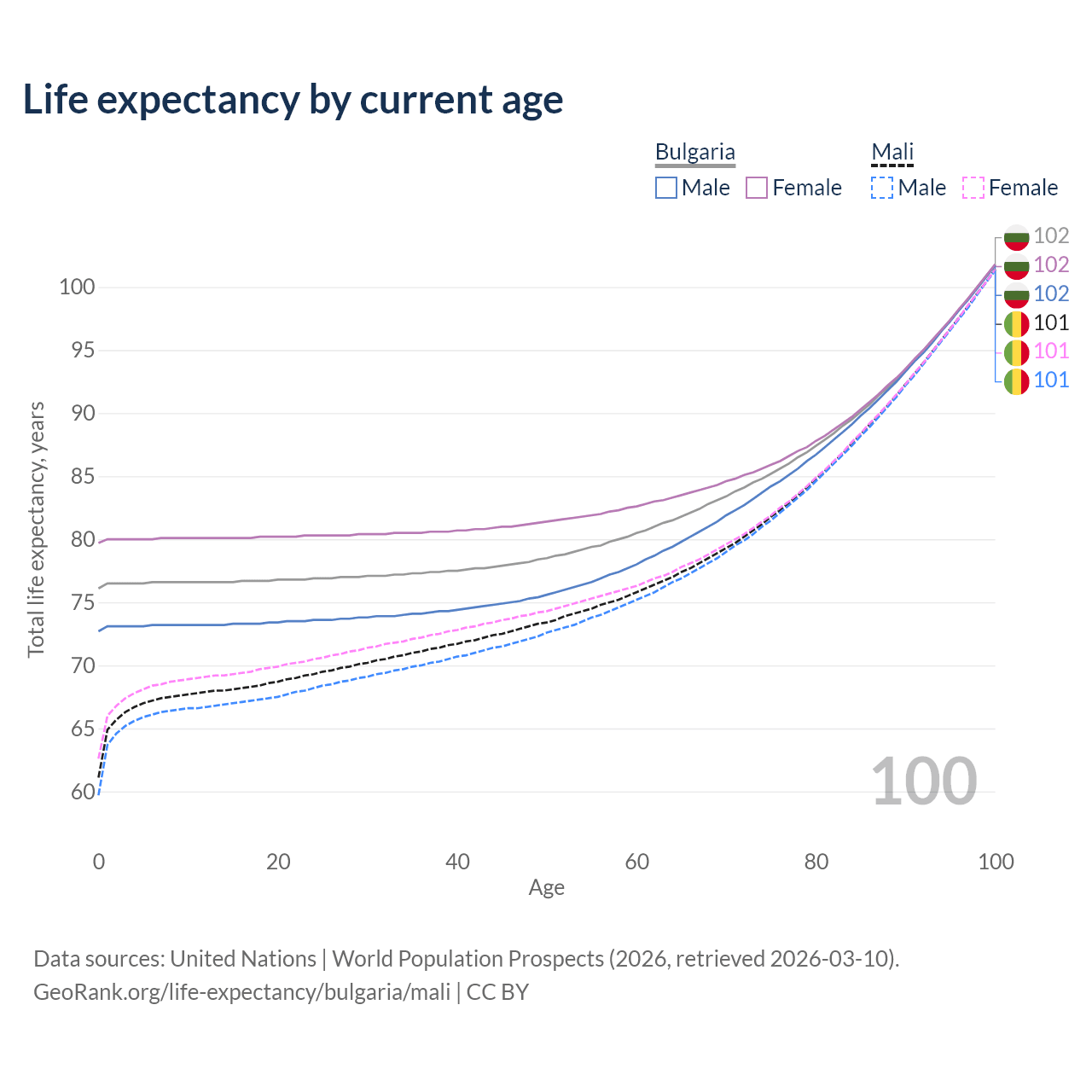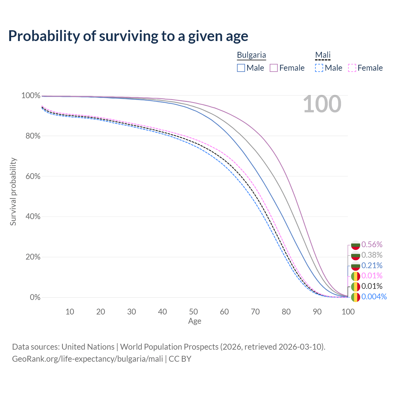 This life expectancy calculator shows the odds of living to 100, 95, 90, and below based on current age for both males and females in Bulgaria and Mali, along with mean and median age of death. The calculations are based on the 2026 life tables (actuarial tables) from the UN World Population Prospects.
