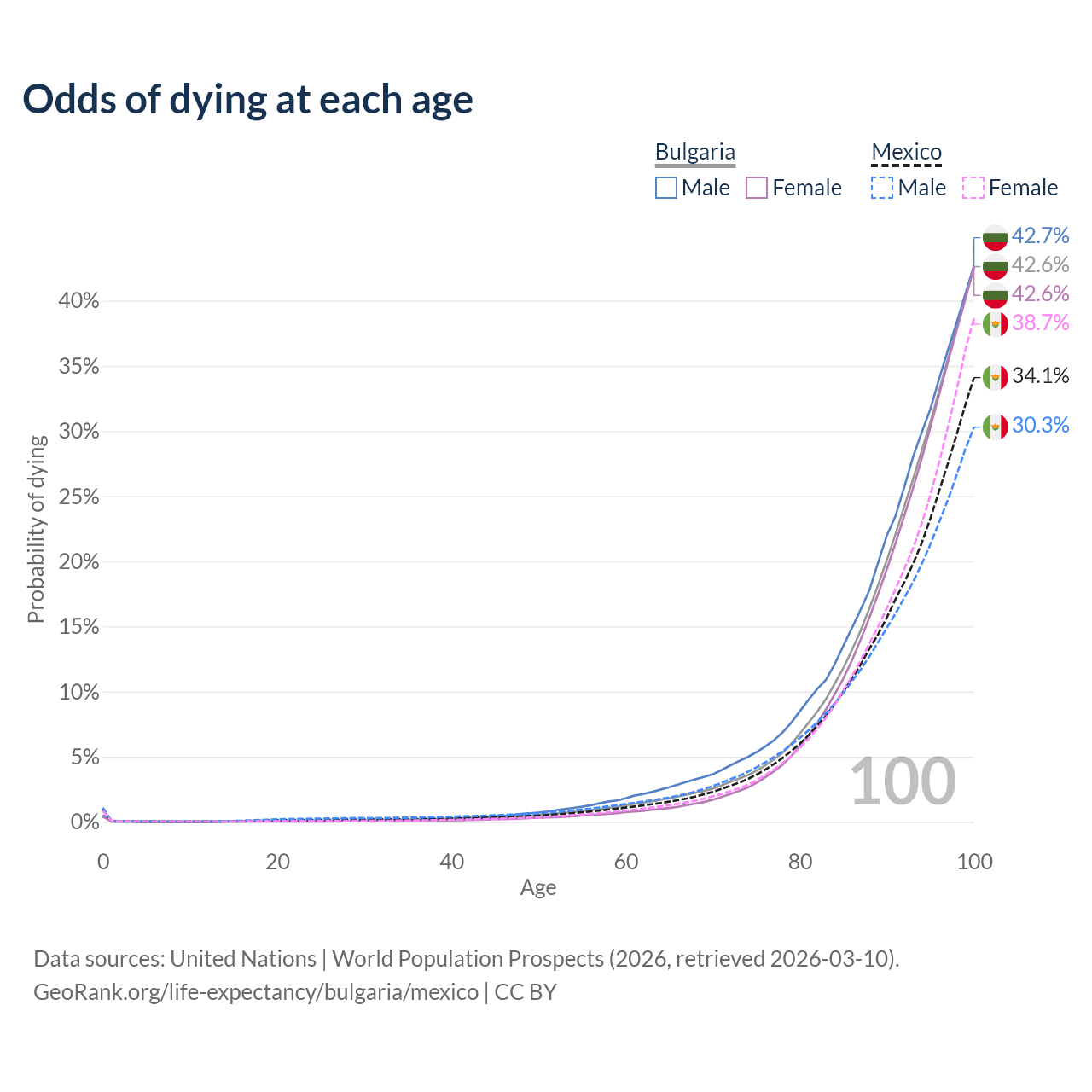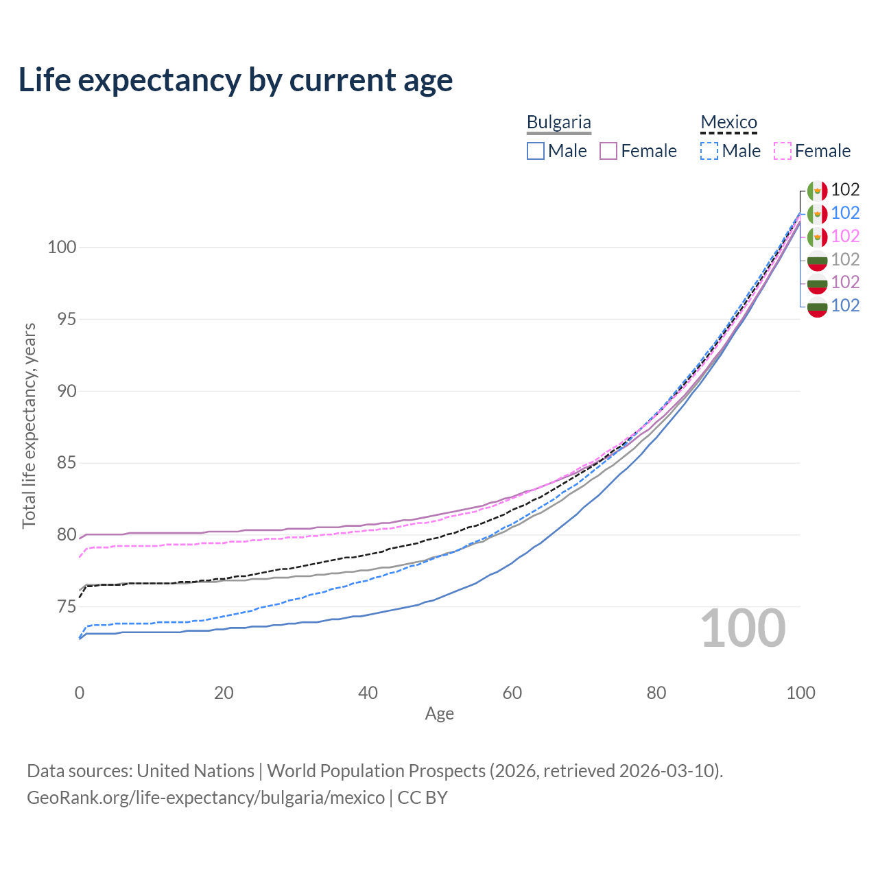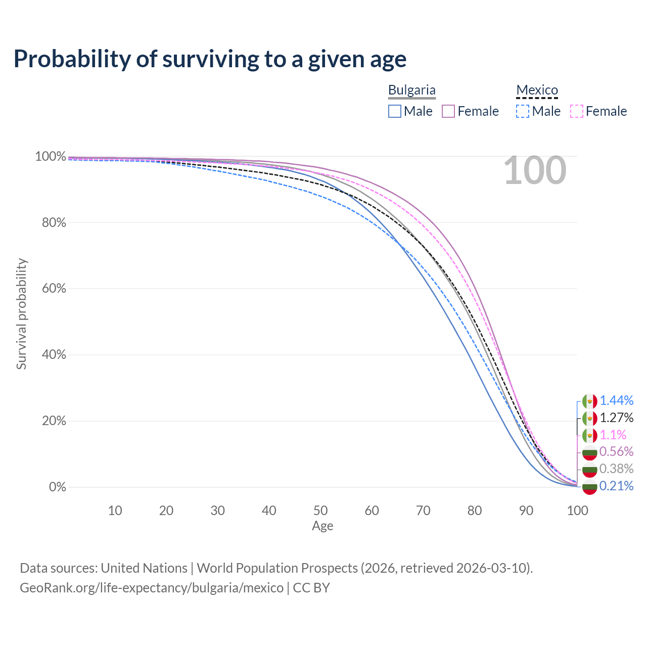 This life expectancy calculator shows the odds of living to 100, 95, 90, and below based on current age for both males and females in Bulgaria and Mexico, along with mean and median age of death. The calculations are based on the 2026 life tables (actuarial tables) from the UN World Population Prospects.