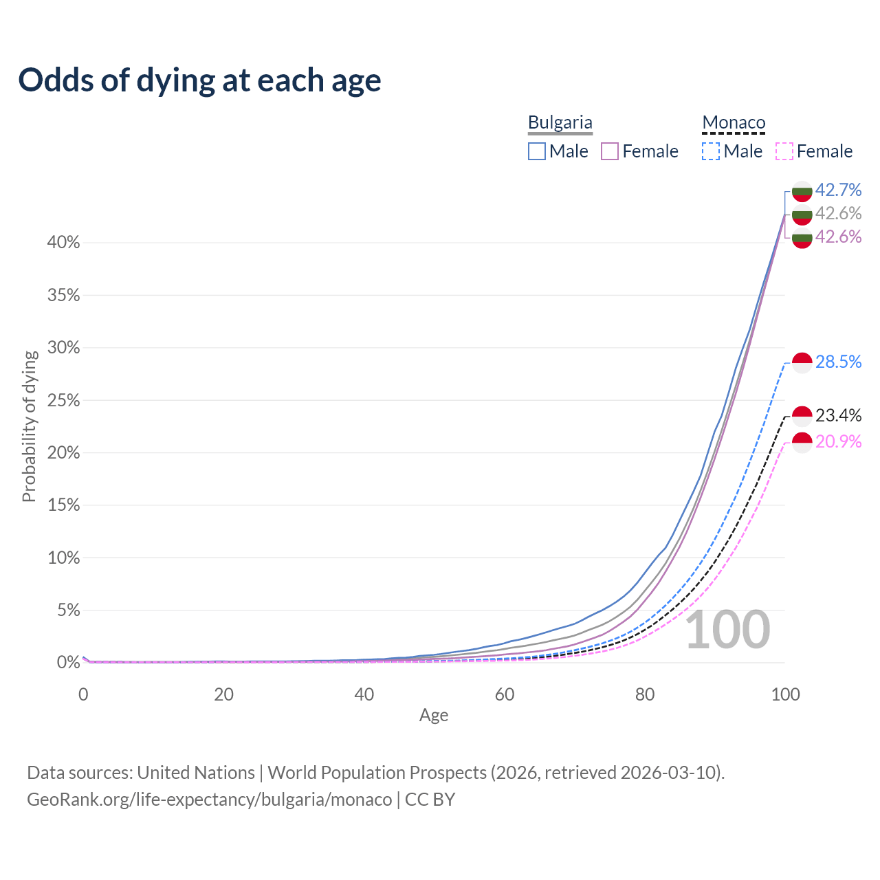 This life expectancy calculator shows the odds of living to 100, 95, 90, and below based on current age for both males and females in Bulgaria and Monaco, along with mean and median age of death. The calculations are based on the 2026 life tables (actuarial tables) from the UN World Population Prospects.