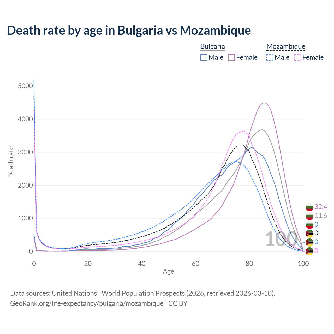 In Bulgaria, the most common age of death is 85, compared to 0 in Mozambique. The median age of death is 79.5 in Bulgaria and 71.2 in Mozambique, meaning only half of each cohort is expected to live past that age.