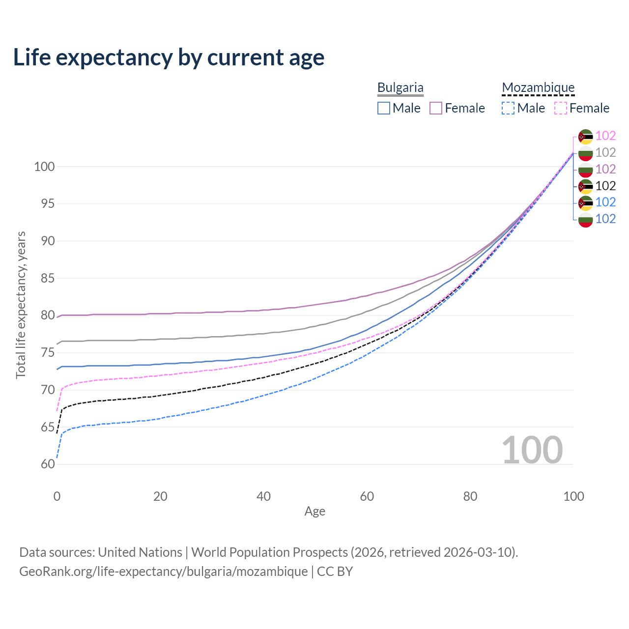This life expectancy calculator shows the odds of living to 100, 95, 90, and below based on current age for both males and females in Bulgaria and Mozambique, along with mean and median age of death. The calculations are based on the 2026 life tables (actuarial tables) from the UN World Population Prospects.