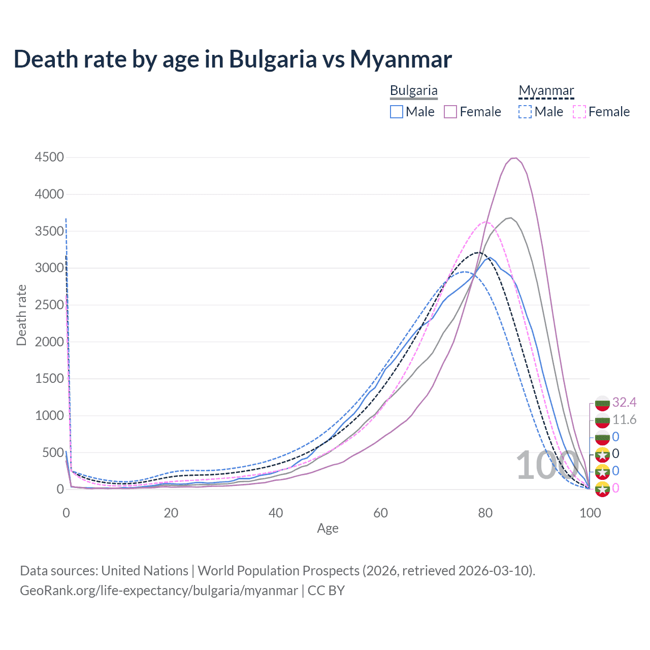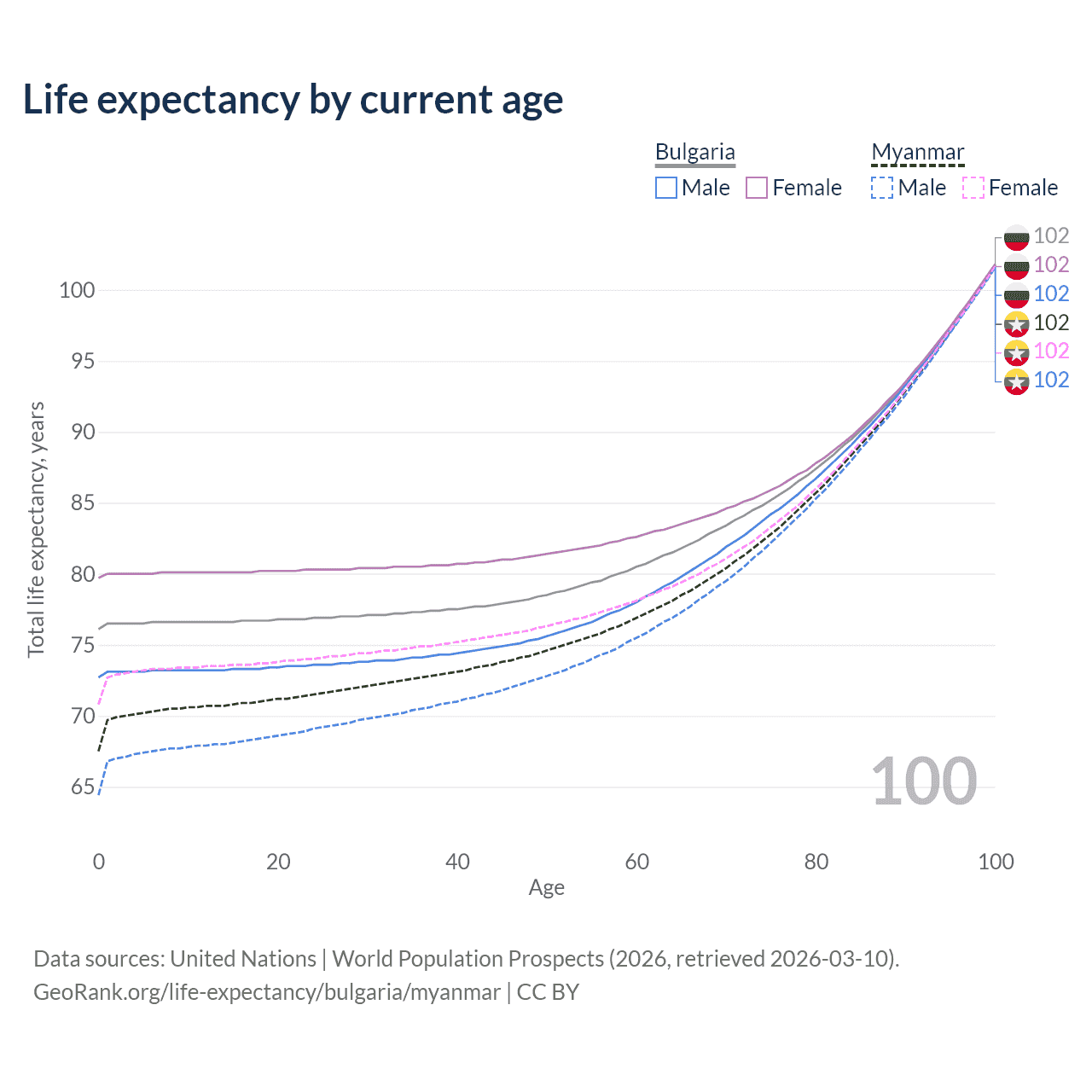 This life expectancy calculator shows the odds of living to 100, 95, 90, and below based on current age for both males and females in Bulgaria and Myanmar, along with mean and median age of death. The calculations are based on the 2026 life tables (actuarial tables) from the UN World Population Prospects.