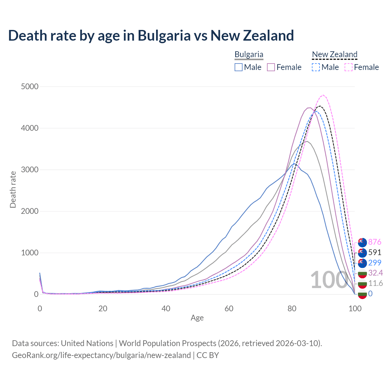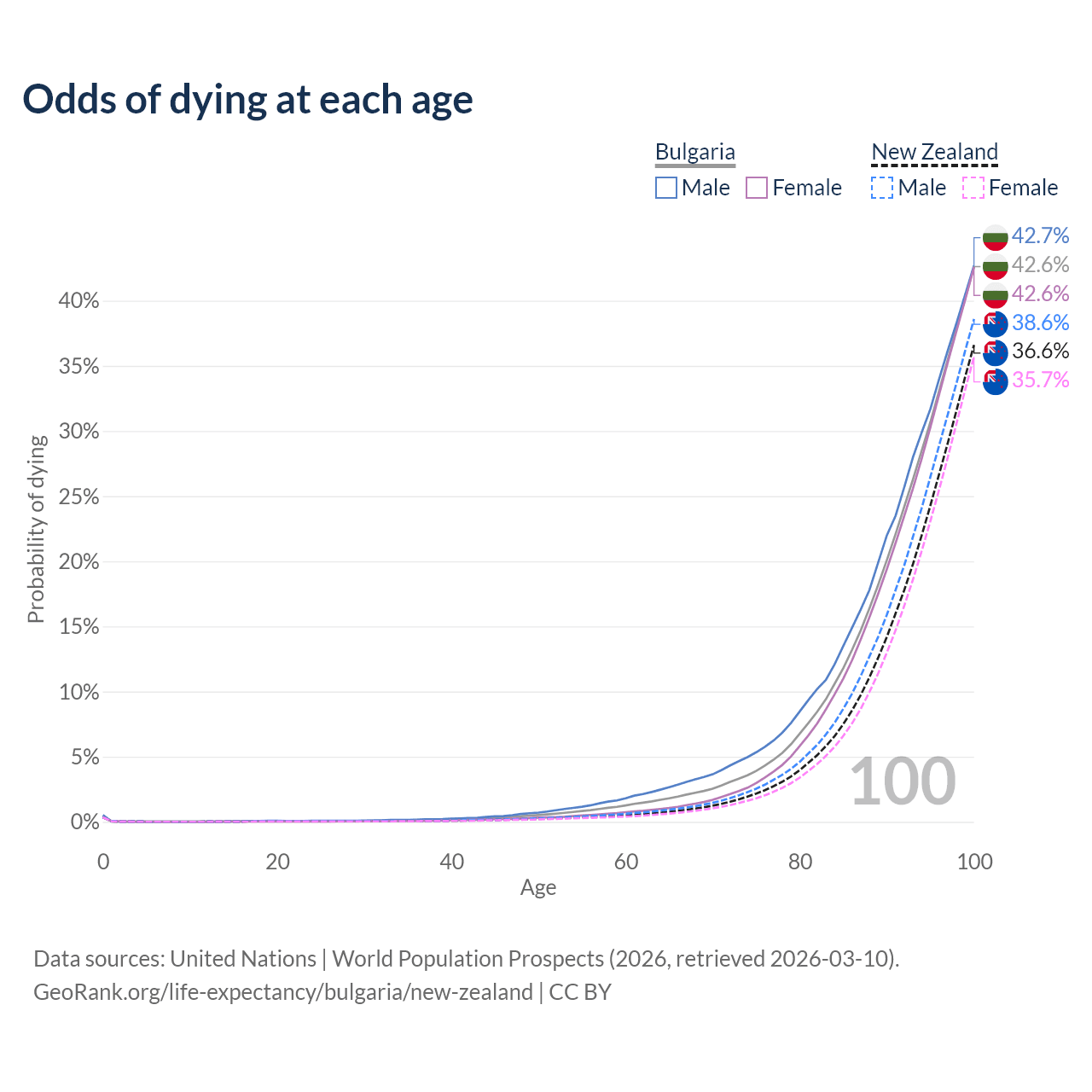 This life expectancy calculator shows the odds of living to 100, 95, 90, and below based on current age for both males and females in Bulgaria and New Zealand, along with mean and median age of death. The calculations are based on the 2026 life tables (actuarial tables) from the UN World Population Prospects.