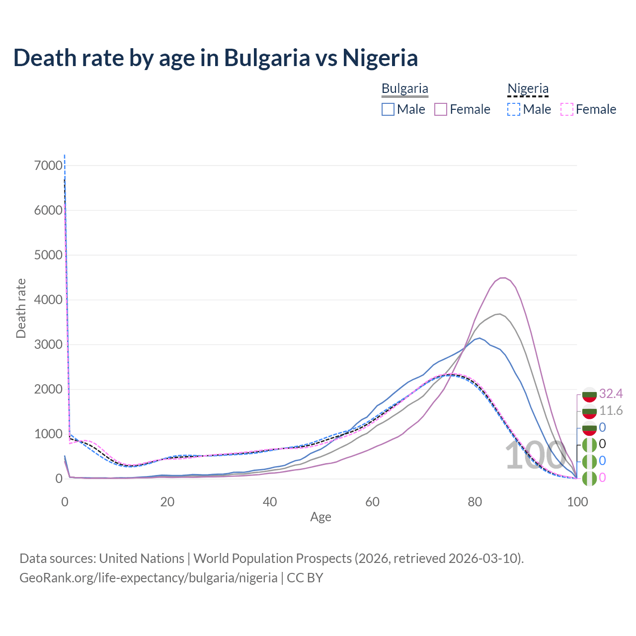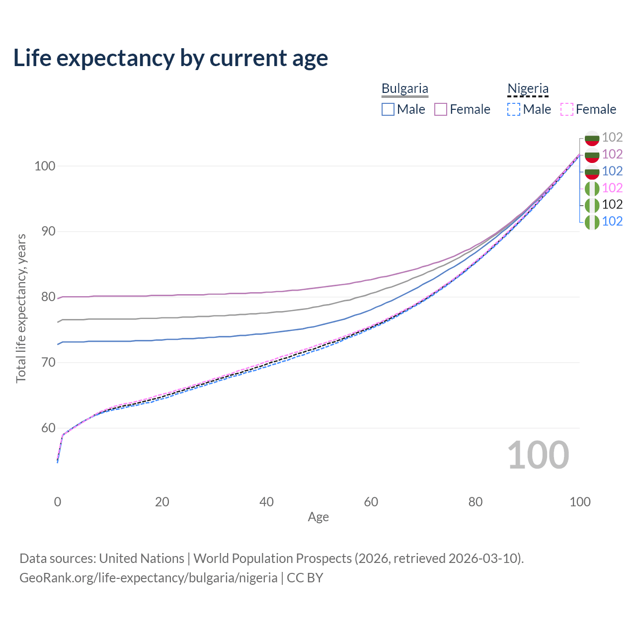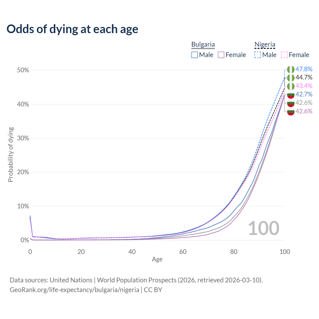 This life expectancy calculator shows the odds of living to 100, 95, 90, and below based on current age for both males and females in Bulgaria and Nigeria, along with mean and median age of death. The calculations are based on the 2026 life tables (actuarial tables) from the UN World Population Prospects.