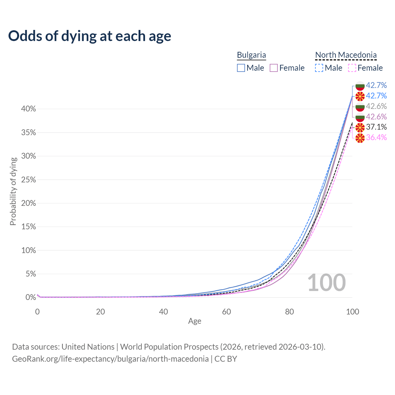 This life expectancy calculator shows the odds of living to 100, 95, 90, and below based on current age for both males and females in Bulgaria and North Macedonia, along with mean and median age of death. The calculations are based on the 2026 life tables (actuarial tables) from the UN World Population Prospects.